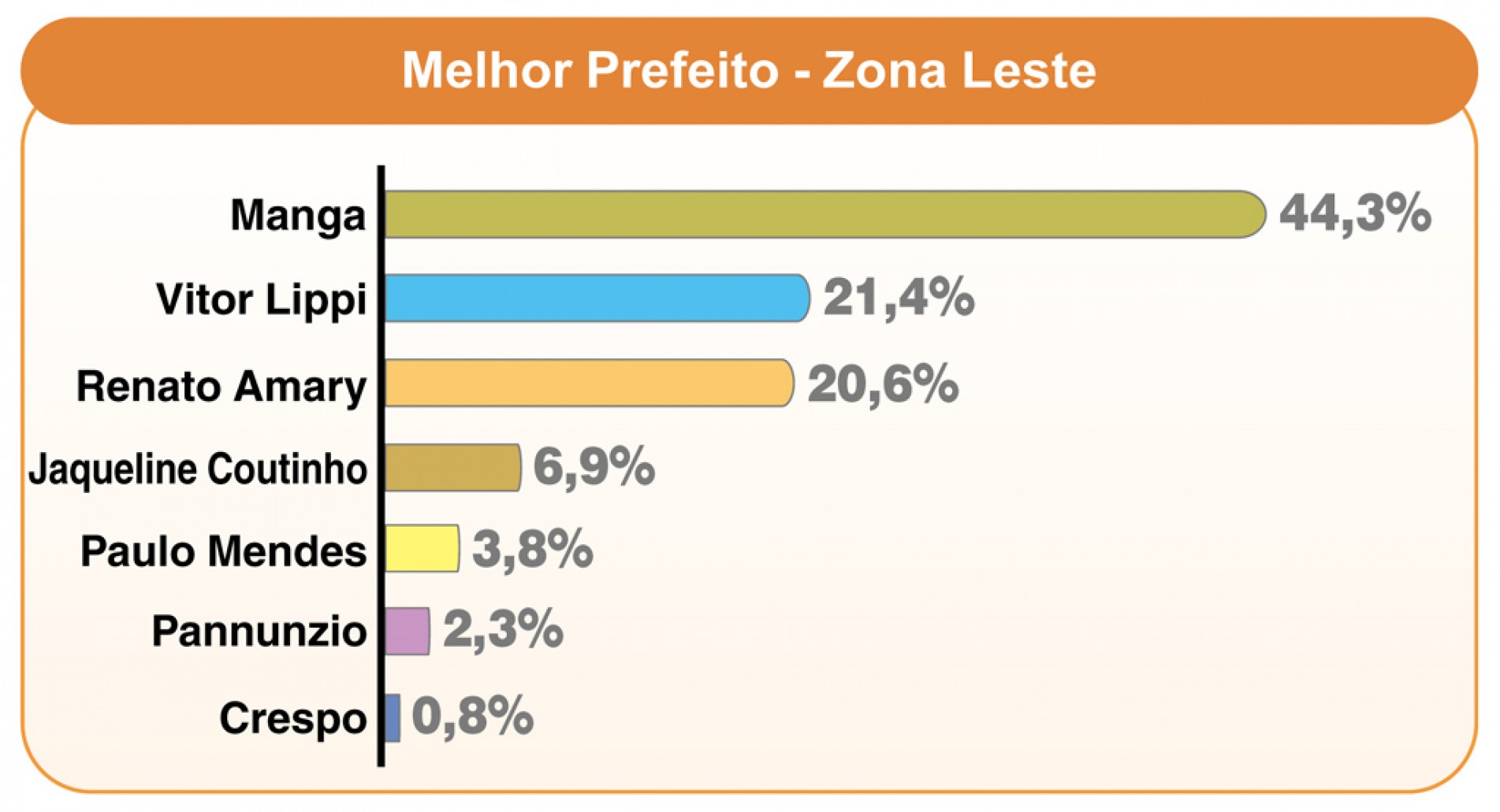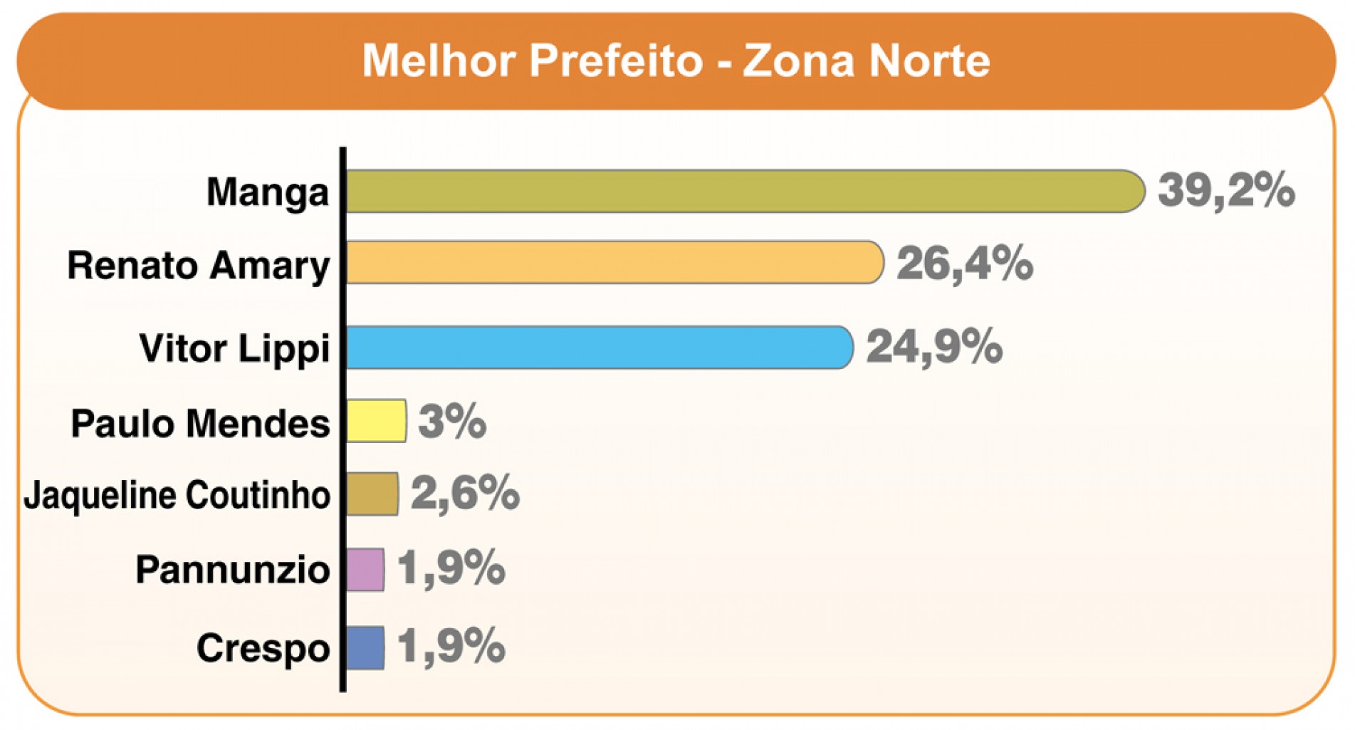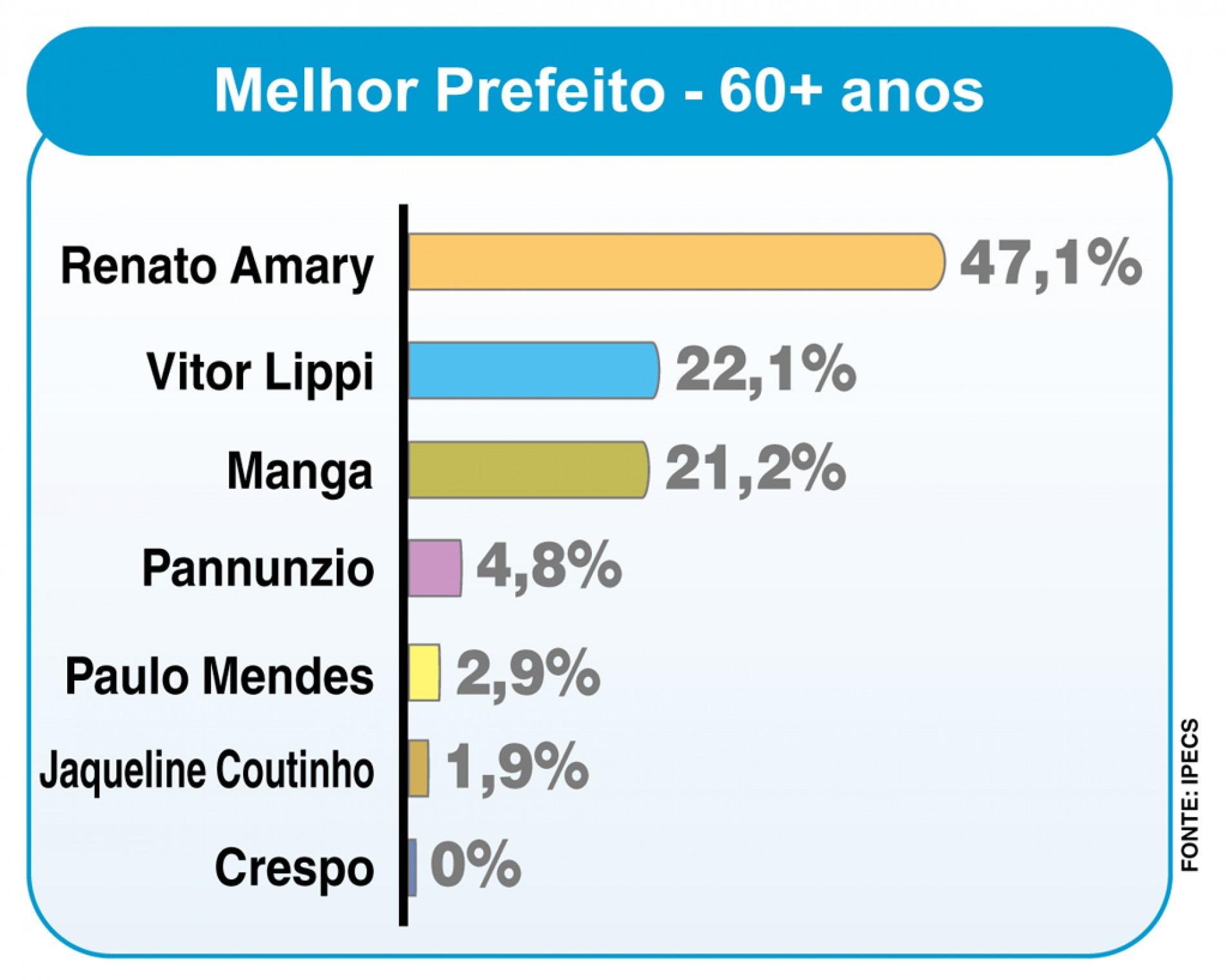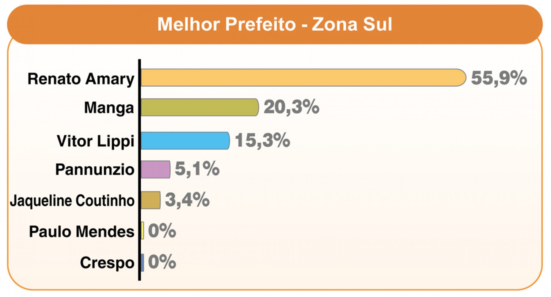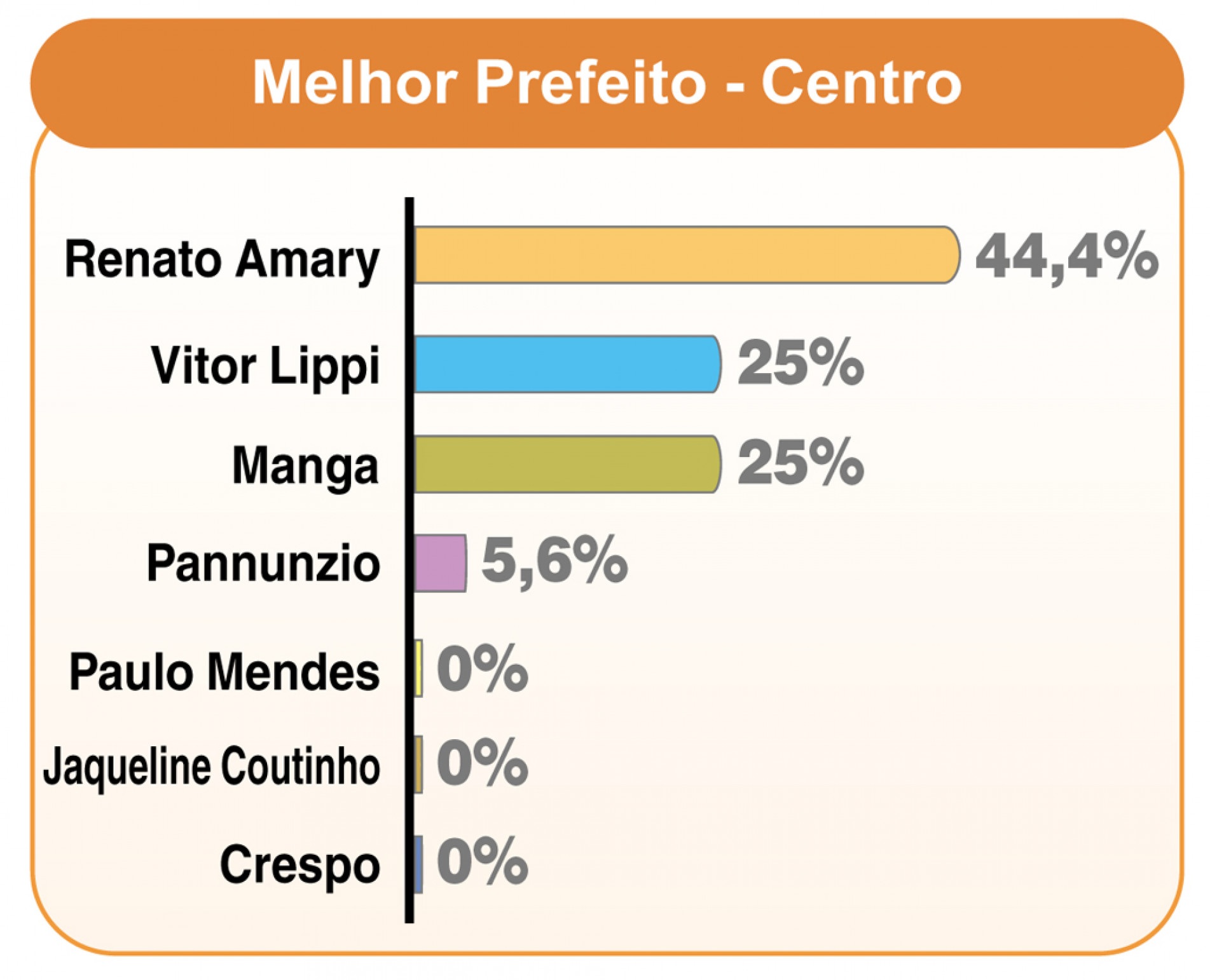 Nos gráficos, os dados da pesquisa são mostrados em três vertentes: por gênero, idade e região da cidade. Atual prefeito Rodrigo Manga e ex-prefeito Renato Amary dividem a preferência