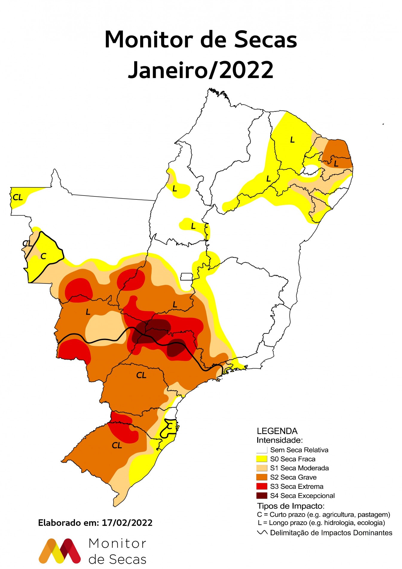 O monitor mostra ainda uma pequena parte do Estado com seca excepcional (cor marrom) e seca extrema (cor vermelha), principalmente no Norte paulista, e uma parte ainda menor, no extremo Sul de São Paulo com seca fraca (cor amarela).