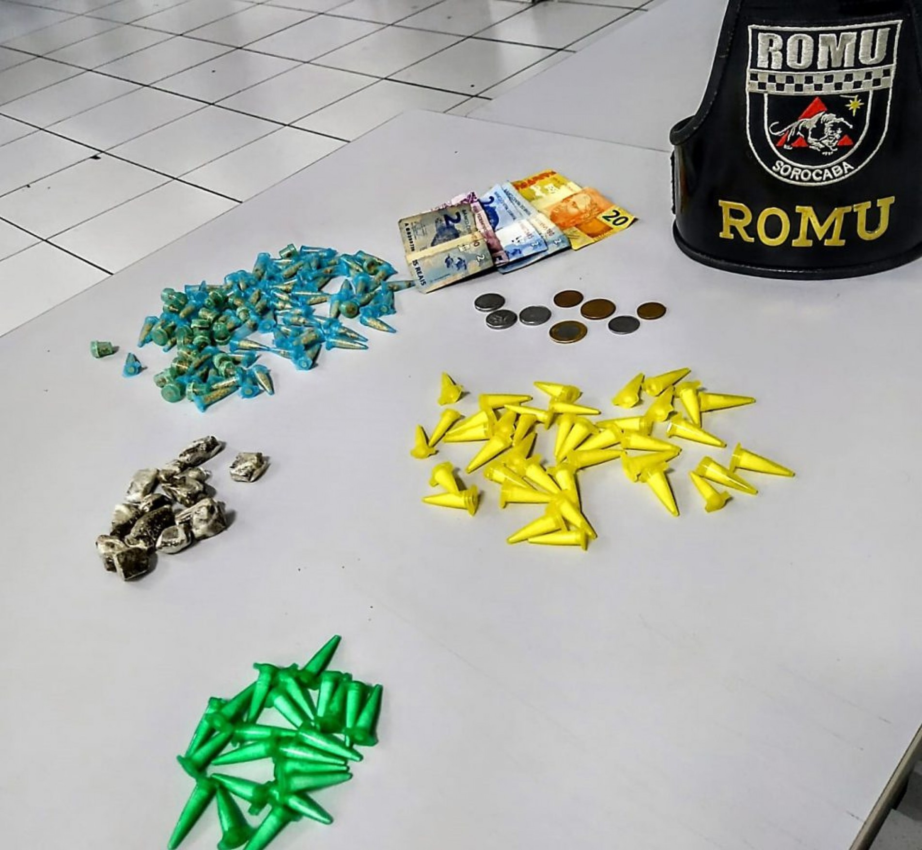 Em revista, os agentes localizaram 103 porções de crack, 61 de cocaína, 14 de maconha e R$ 34 no bolso da blusa do suspeito. De acordo com a guarda civil, o rapaz admitiu vender drogas no local. Ao pesquisar os antecedentes criminais do homem, a Romu constatou que ele era procurado pela Justiça e tinha três mandados de prisão. O suspeito havia saído do presídio de Hortolândia, no interior de São Paulo, no dia 21 de março deste ano.