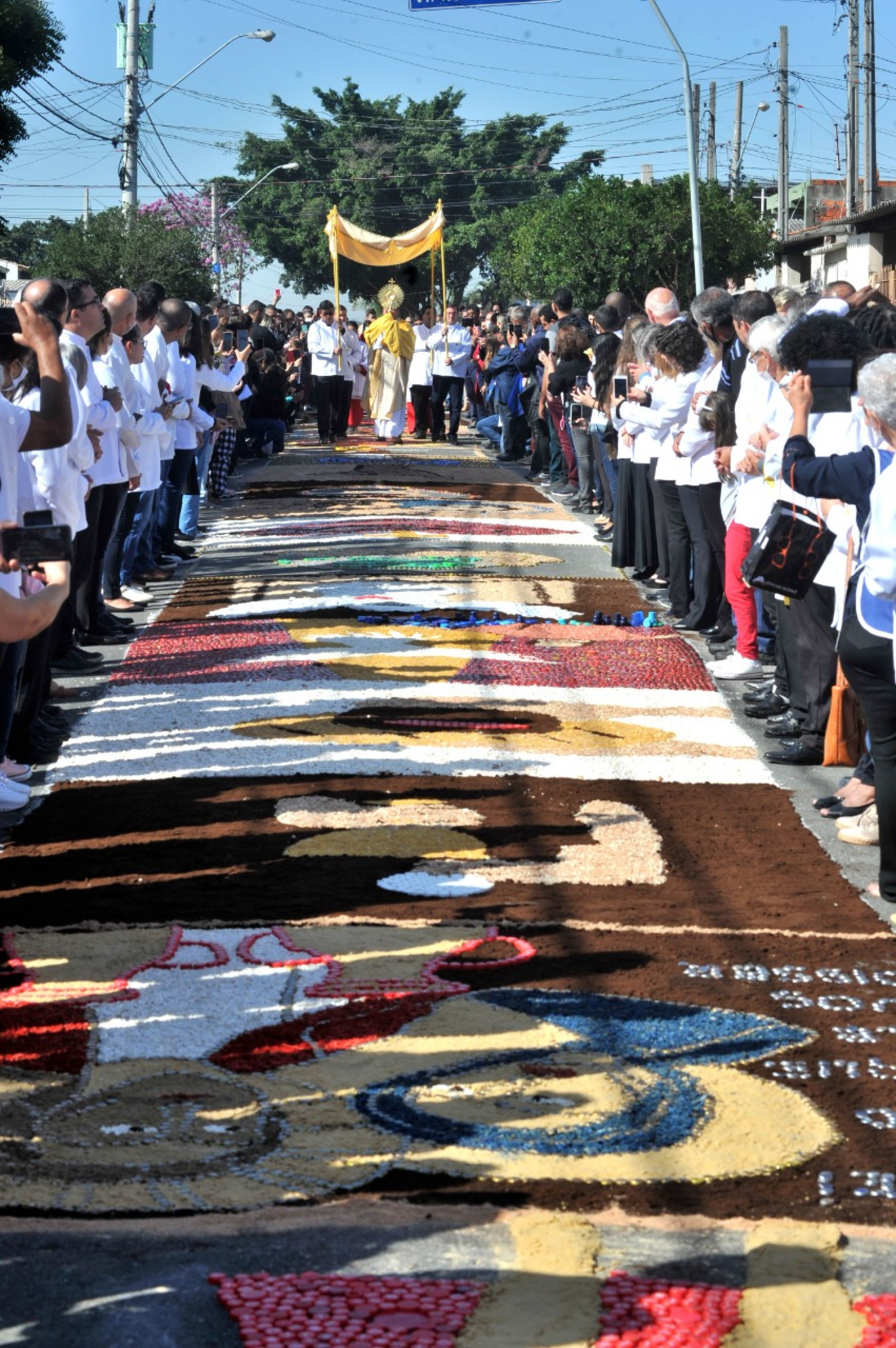 Além da cerimônia religiosa e da procissão, o tapete voltou a ser montado na em frente à igreja do Sagrado Coração de Jesus -- a Alameda Guarujá. O trabalho começou na na noite de quarta-feira (15) e durou aproximadamente oito horas. Entre 20 e 25 pessoas deram forma ao ornamento de 2,5 metros de extensão e constituído por 24 imagens repletas de cores. Ele cobriu um quarteirão da via. Os símbolos foram feitos com cascas de ovos, serragem, pó de café, areia, pedras para aquário e tampas de garrafa.