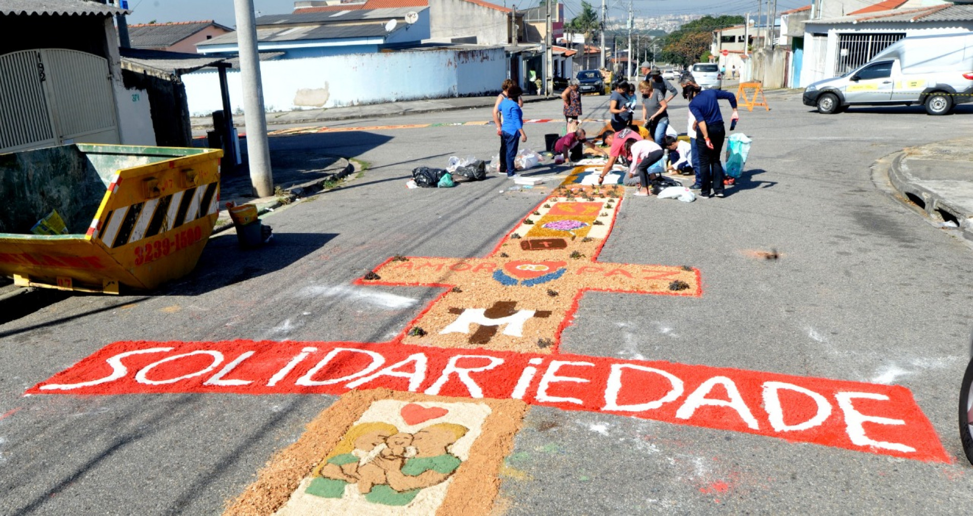 Envolvido ativamente e há tanto tempo na confecção do tapete, Caroquer sentiu falta de realizá-lo nos últimos dois anos. A saudade era tanta que, no ano passado, ele teve uma ideia para manter o costume. Fez desenhos em cartolinas e colou na fachada da paróquia. Agora, comemora o retorno do formato tradicional. “É muito gostoso. Quando você faz algo que gosta, não consegue parar”. A motorista de van escolar Tânia Regina Riovezan, de 58 anos, ajudou na montagem pela primeira vez. Apesar do cansaço, considera que a experiência valeu a pena. “É muito gratificante.”