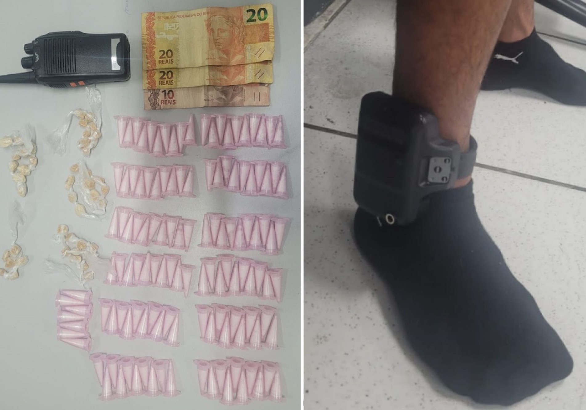 Durante patrulhamento, a equipe policial avistou o homem descendo uma escada com um aparelho comunicador em mãos e um volume em sua cintura. Na abordagem, os policiais localizaram 127 tubos de cocaína, 46 pedras de crack, R$ 50 em espécie e constataram o uso de tornozeleira eletrônica. Questionado, o homem informou que estava de saída temporária.