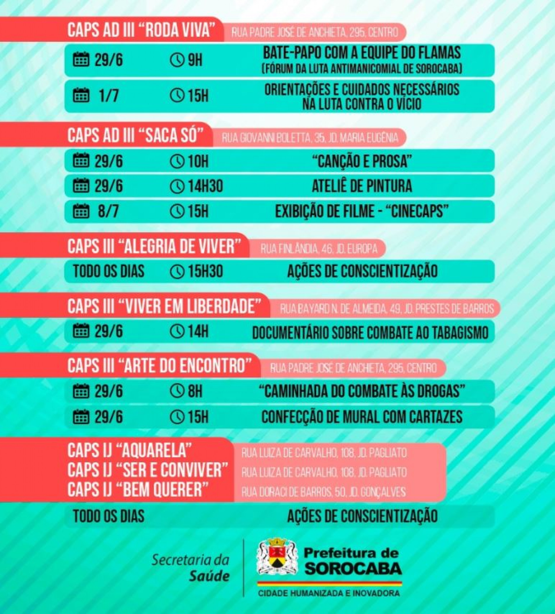 Por sua vez, a programação em prol do combate às drogas no CAPS AD III “Roda Viva” traz atividades com grupos abertos aos familiares, incluindo pessoas que façam parte das redes de apoio dos atendidos pela unidade. Nesta quarta-feira (29), às 9h, será realizado um bate-papo com a equipe do Flamas (Fórum da Luta Antimanicomial de Sorocaba). Na sexta-feira (1), às 15h, as atividades serão destinadas às pessoas próximas dos atendidos pela unidade, com orientações e cuidados necessários na luta contra o vício.