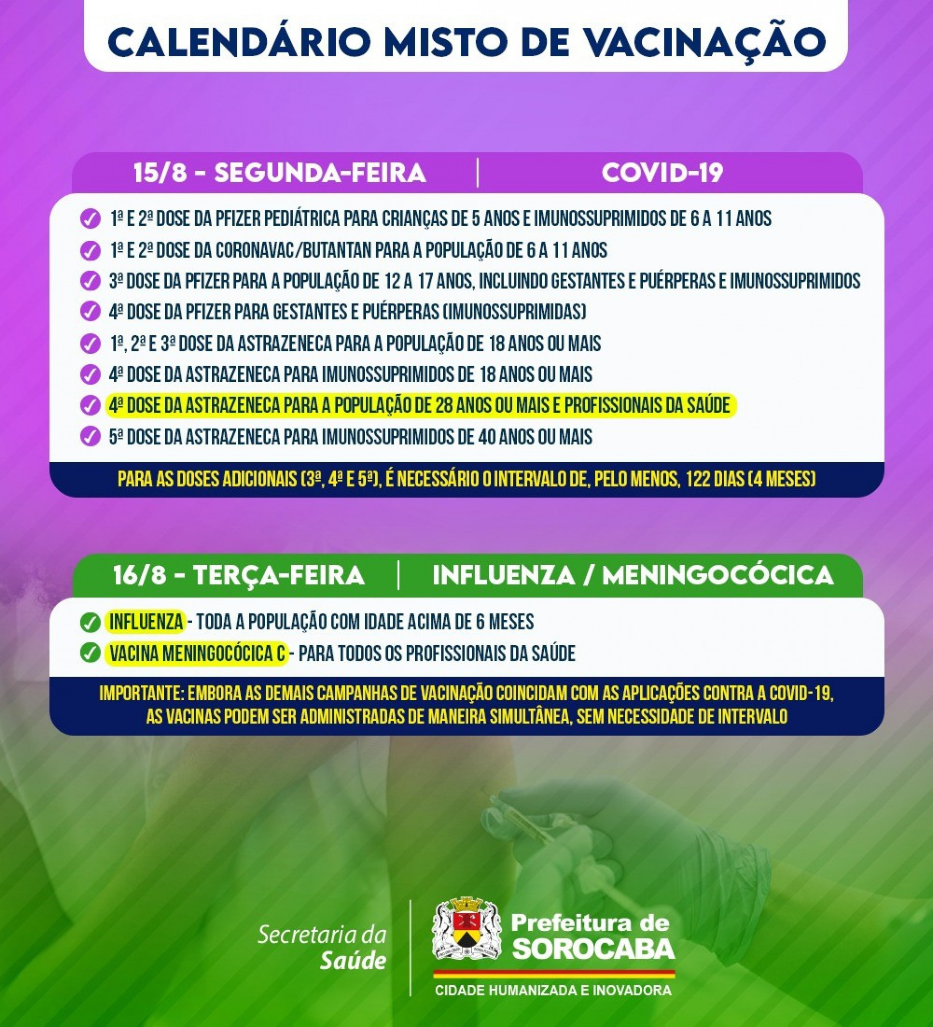 Importante: Embora as demais campanhas de vacinação coincidam com as aplicações contra a Covid-19, as vacinas podem ser administradas de maneira simultânea, sem necessidade de intervalo.