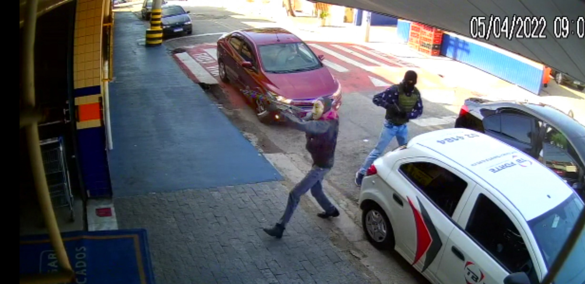 Na manhã do dia 5 de abril, três homens fortemente armados invadiram o supermercado e roubaram dinheiro de um caixa eletrônico instalado dentro do estabelecimento. Eles chegaram ao local em um Honda City preto, com máscaras de palhaço, capuzes e peruca. Um quarto criminoso participou da ação, mas ficou do lado de fora, aguardando os demais no veículo. A quadrilha agiu enquanto a três funcionários da empresa de valores faziam a manutenção no equipamento.