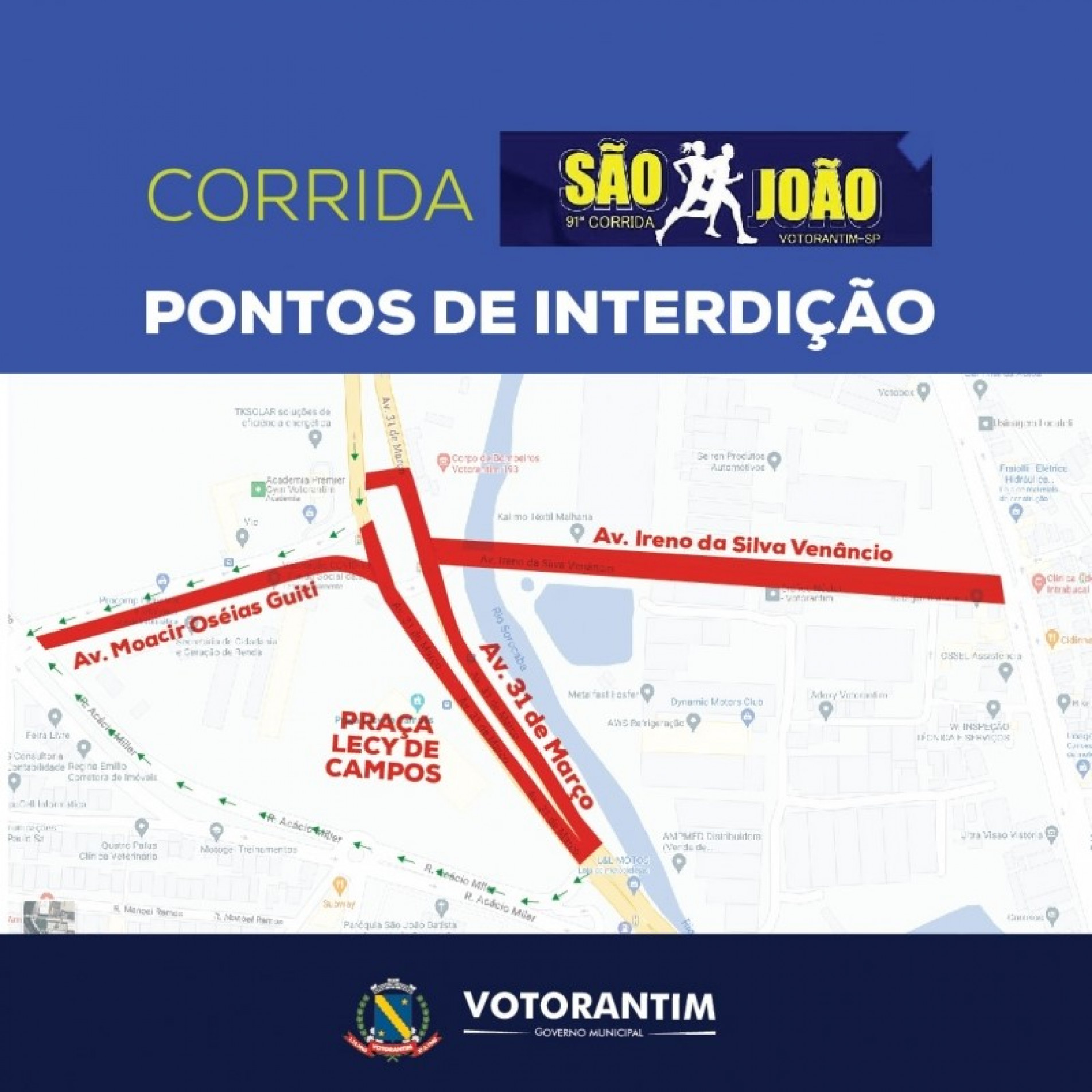 A avenida 31 de Março terá as duas vias interditadas, na extensão da Praça Lecy de Campos durante a Corrida. No sentido Sorocaba Votorantim, o desvio poderá ser feito pela pista da direita da avenida Moacir Oséias Guitte. No sentido Votorantim Sorocaba, poderá ser desviado pela rua Acácio Miller.