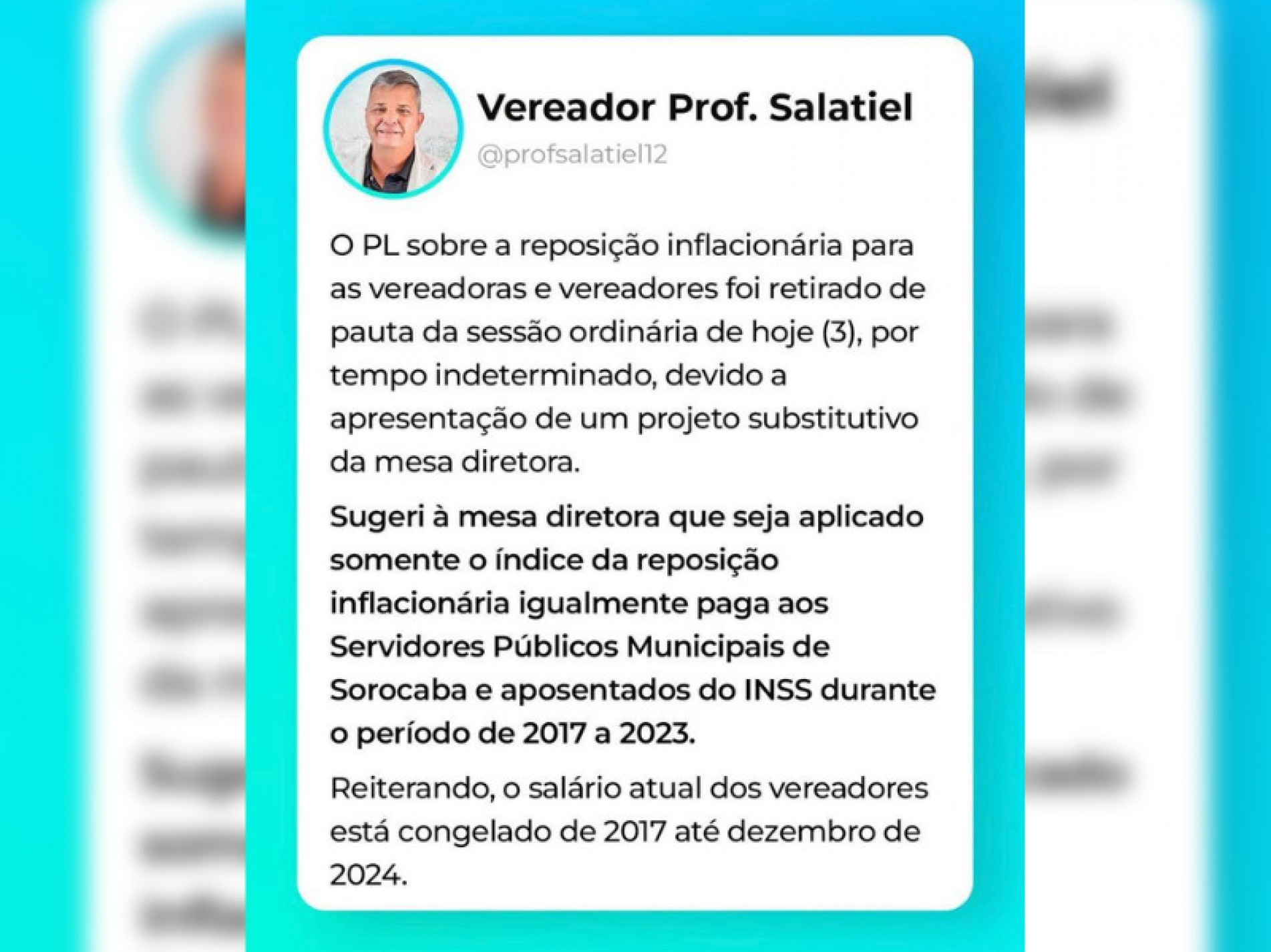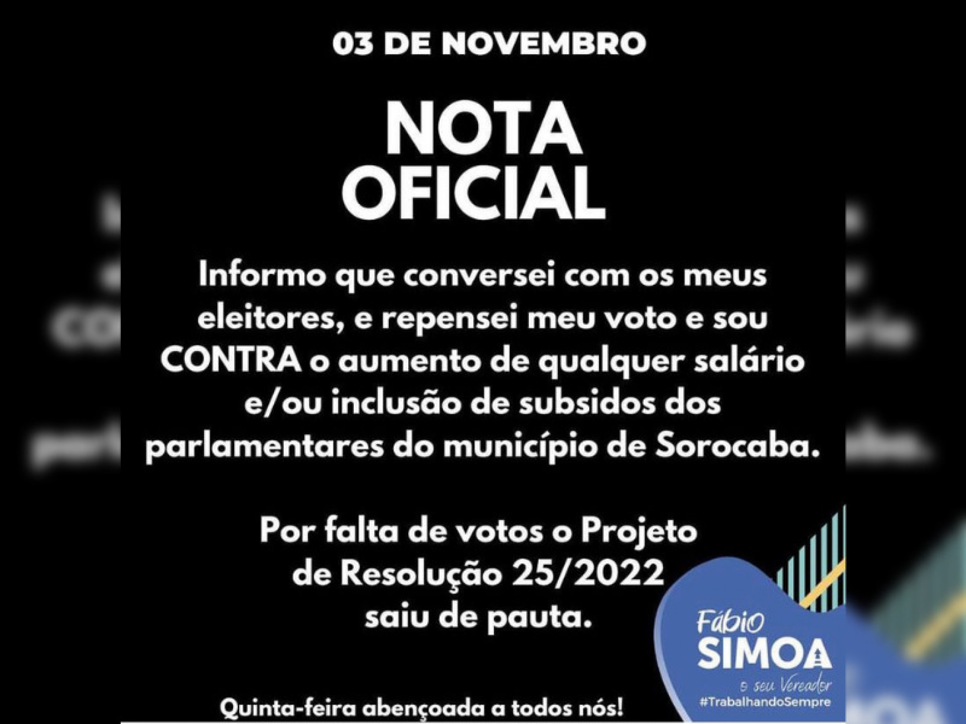 "Informo que conversei com os meus eleitores, e repensei meu voto e sou CONTRA o aumento de qualquer salário e/ou inclusão de subsídios dos parlamentares do município de Sorocaba. Por falta de votos o Projeto de Resolução 25/2022 saiu de pauta"