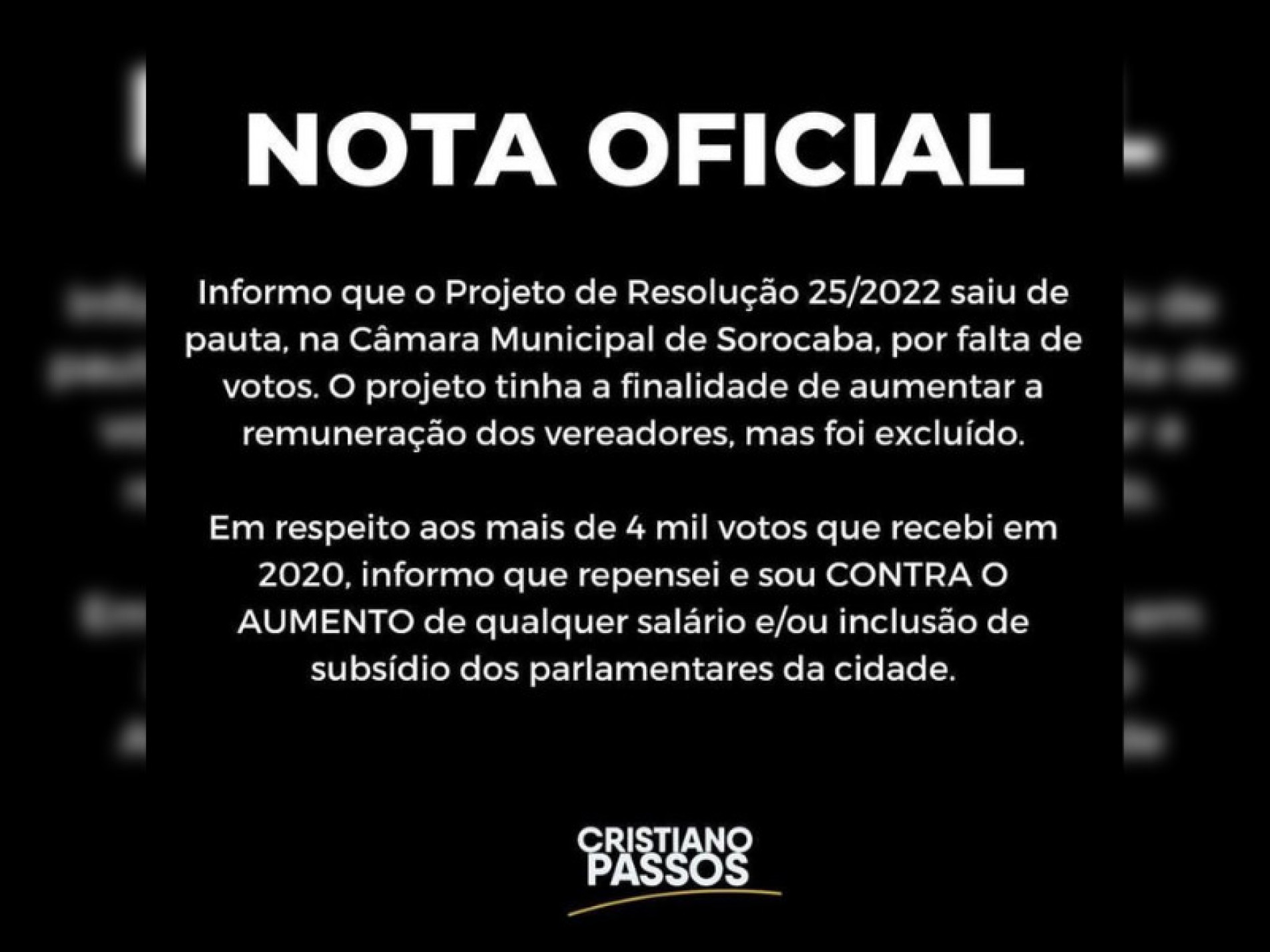 Em respeito aos mais de 4 mil votos que recebi em 2020, informo que repensei e sou CONTRA O AUMENTO de qualquer salário e/ou inclusão de subsídio dos parlamentares da cidade"