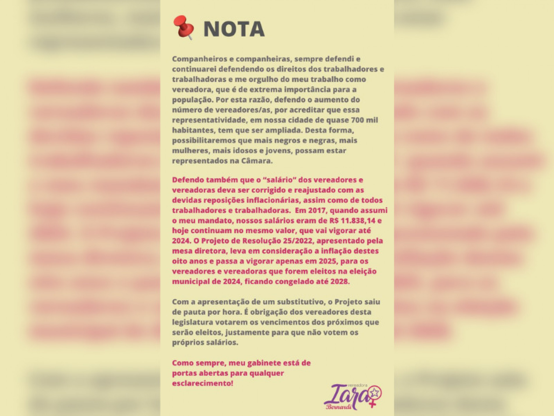"Companheiros e companheiras, sempre defendi e continuarei defendendo os direitos dos trabalhadores e trabalhadoras e me orgulho do meu trabalho como vereadora, que é de extrema importância para a população. Por esta razão, defendo o aumento do número de vereadores/as, por acreditar que essa representatividade, em nossa cidade de quase 700 mil habitantes, tem que ser ampliada. Desta forma, possibilitaremos que mais negros e negras, mais mulheres, mais idosos e jovens, possam estar representados na Câmara.