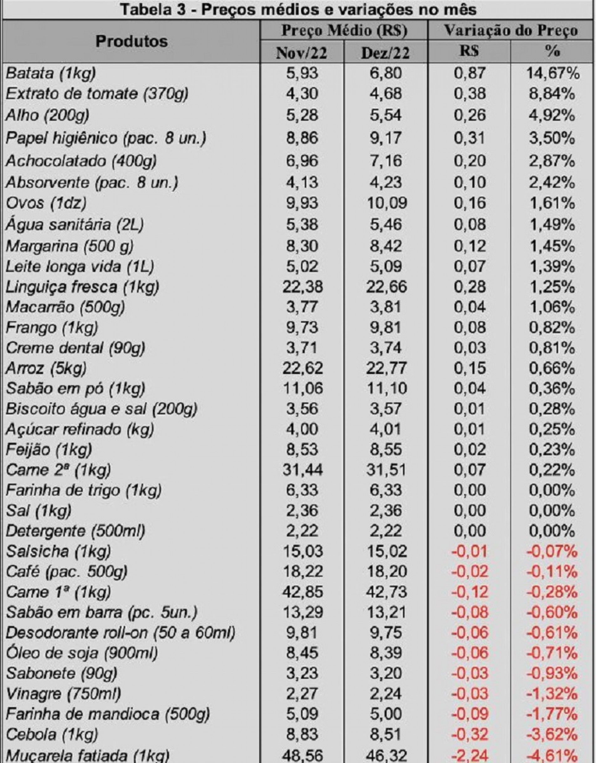 Dos 34 itens da cesta básica, 20 deles apresentaram alta no preço em dezembro de 2022. A batata foi o item com maior alta, passando de R$ 5,93 (kg) em novembro, para R$ 6,80 (kg) em dezembro, um aumento de 14,67%. A alta ocorreu devido ao aumento dos custos de produção e pelo clima adverso ao longo do ano.