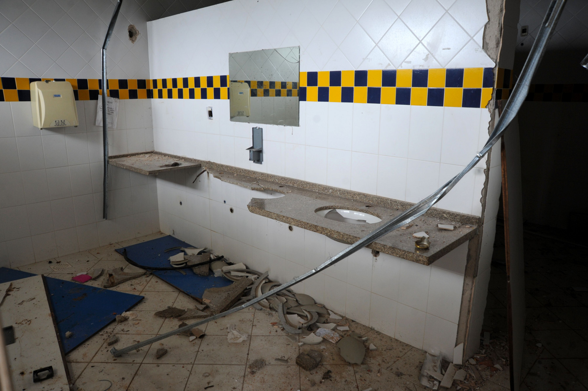 Janelas e paredes quebradas, vidros e pedaços de granito por toda parte, mato alto e muitas salas sem o forro de gesso, destruído por pessoas que aproveitam o abandono do imóvel para furtar alumínio, fiação elétrica, torneiras, corrimão e tudo o que se possa tirar de um local abandonado.