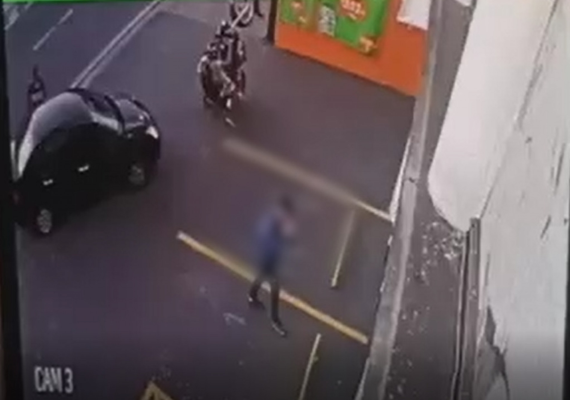 Na imagem é possível ver que um deles aguarda na calçada da loja em uma motocicleta. Em seguida, o outro homem sai carregando um notebook. Segundos depois, o vendedor do estabelecimento tenta recuperar o aparelho, porém, é atingido por um soco no rosto. Assim, o condutor dá partida novamente no veículo, mas a motocicleta empina e ambos caem. Com a fuga desastrosa, o vendedor retorna e pega o notebook.