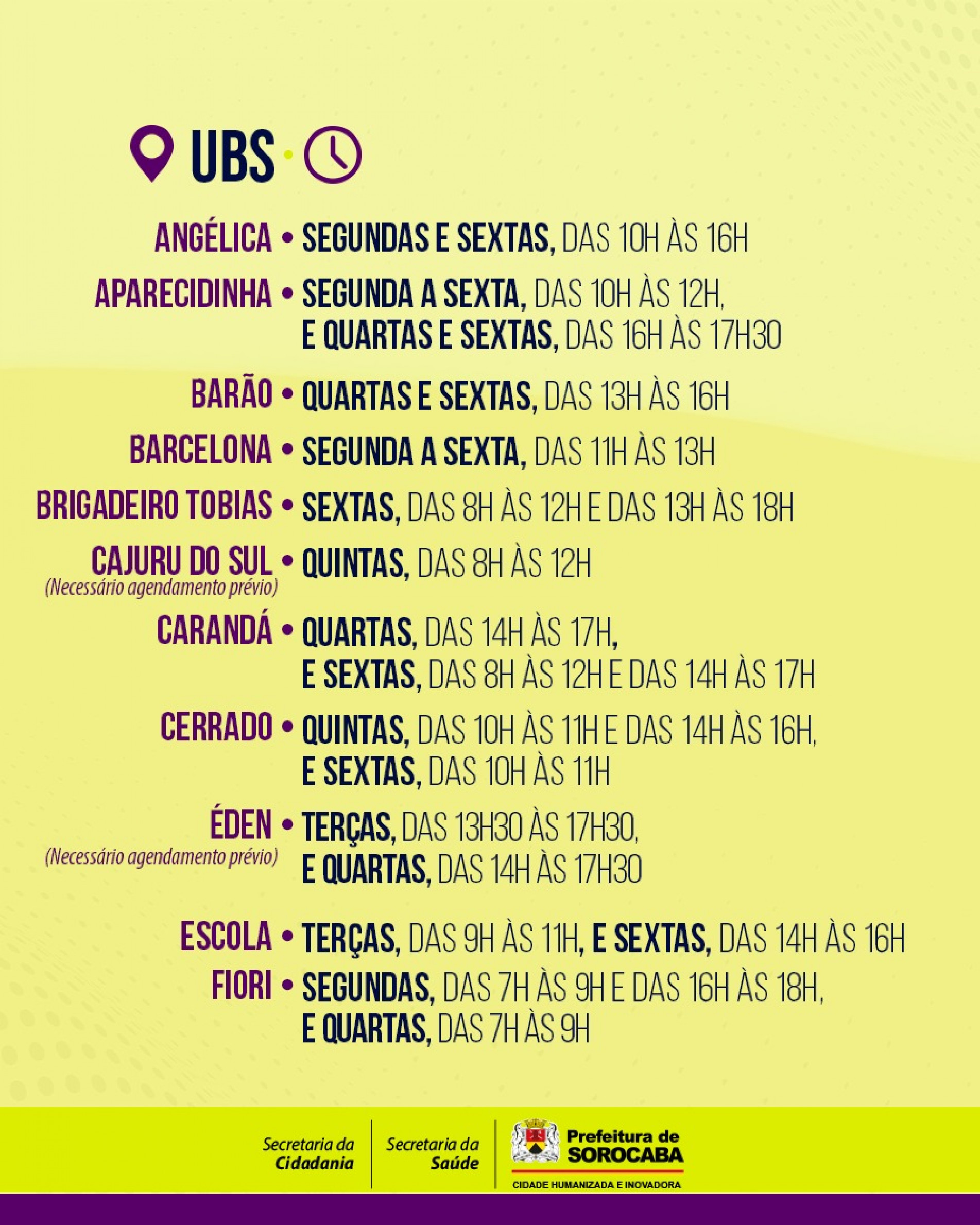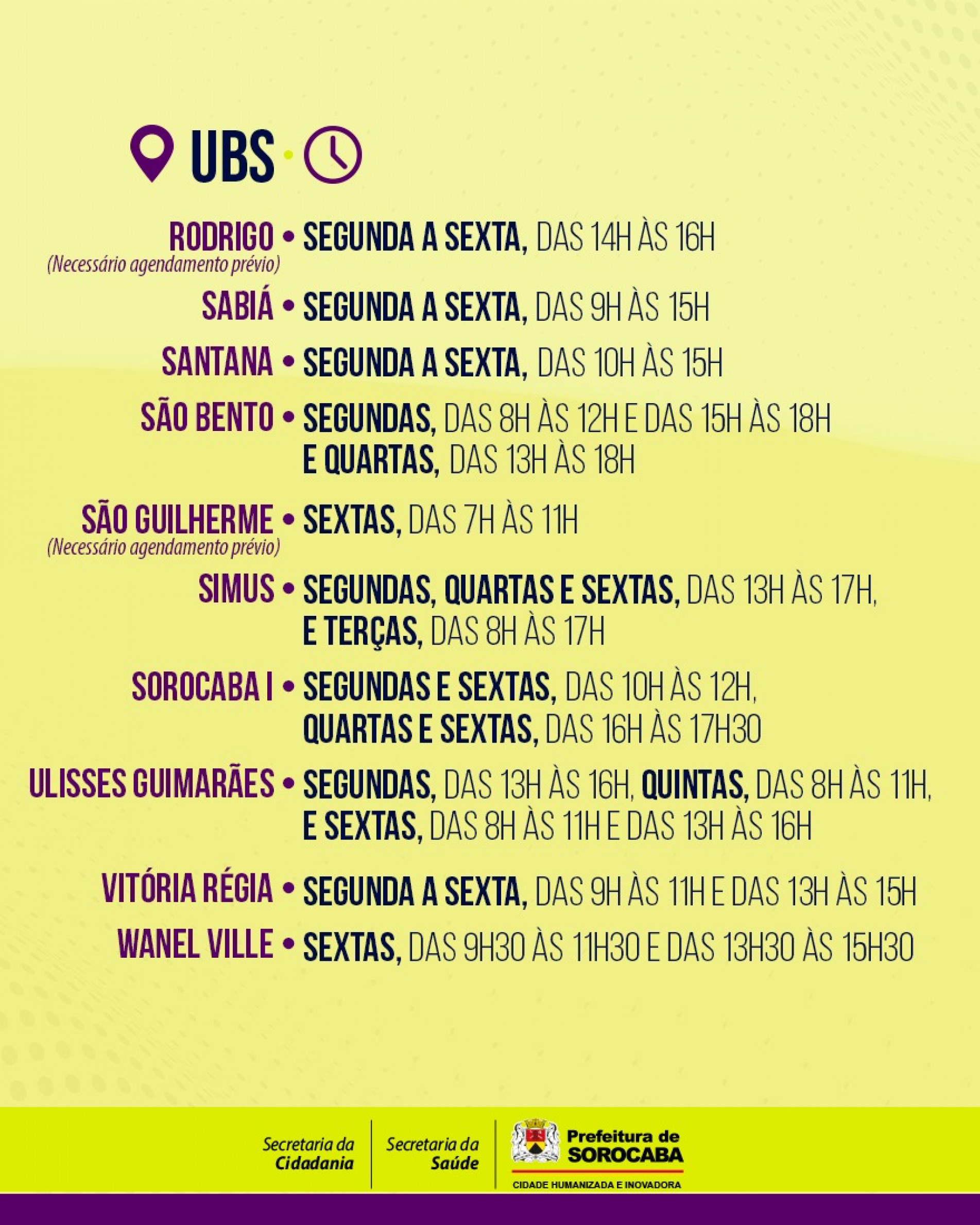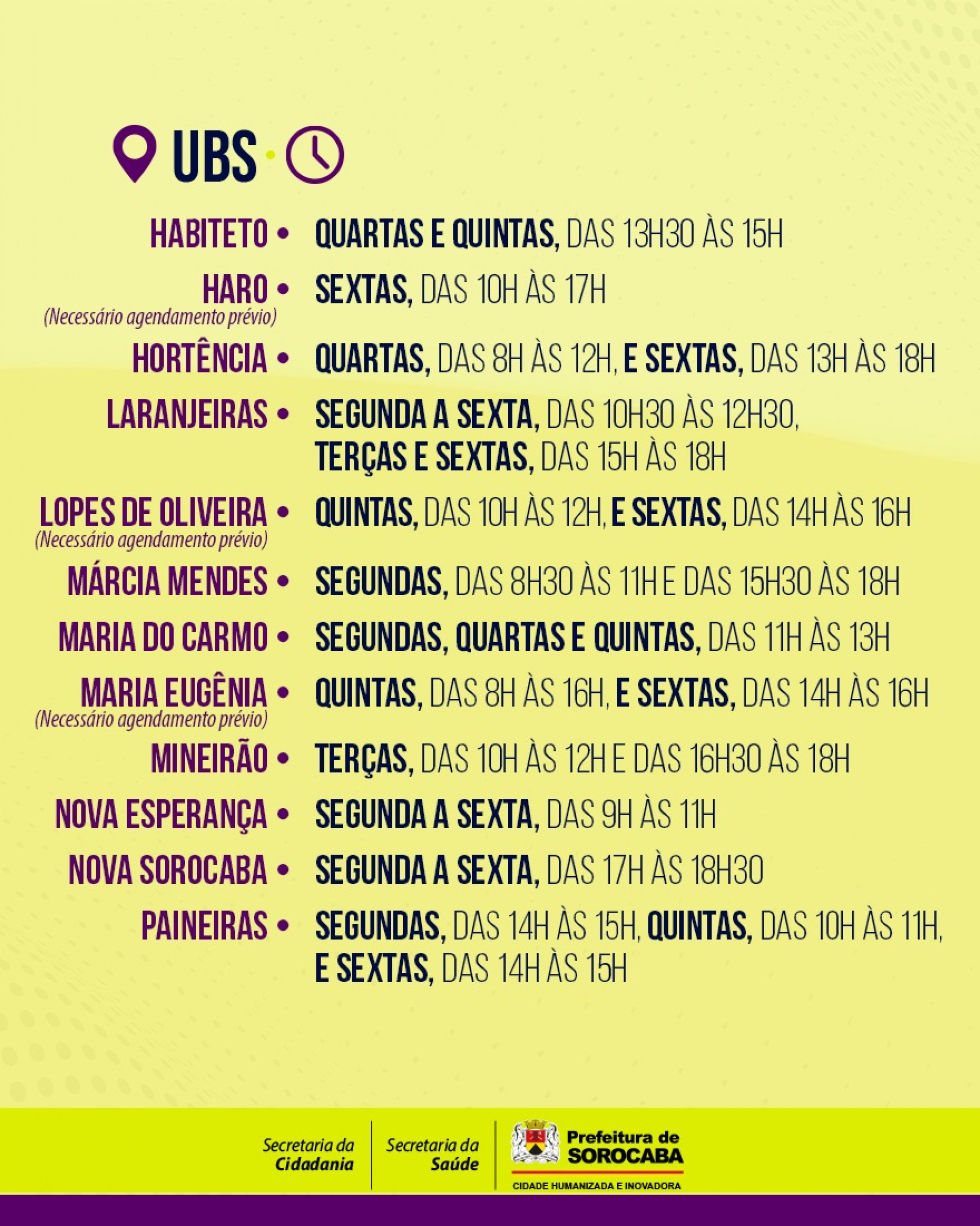 A Prefeitura de Sorocaba divulgou, nesta quinta-feira (1º), os dias e os horários disponíveis nas UBSs (Unidades Básicas de Saúde), para que as famílias registradas no Cadastro Único (CadÚnico) e beneficiárias do programa federal Bolsa Família possam realizar a pesagem requerida de mulheres e crianças. A pesagem pode ser feita na UBS mais próxima da residência da família, conforme datas e horários relacionados.