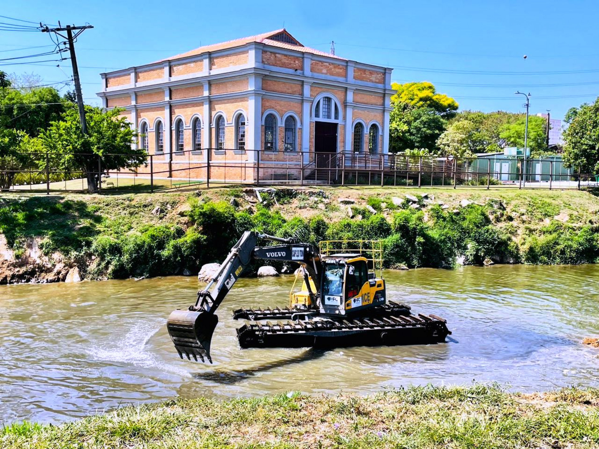 Nesta segunda-feira (25), as máquinas continuam com os trabalhos de desassoreamento do rio, no trecho localizado nas proximidades da Usina Cultural e da ponte da Rua Padre Madureira, sem a necessidade de interdição viária, pois o descolamento dos caminhões é realizado pela via de acesso para a Usina Cultural.