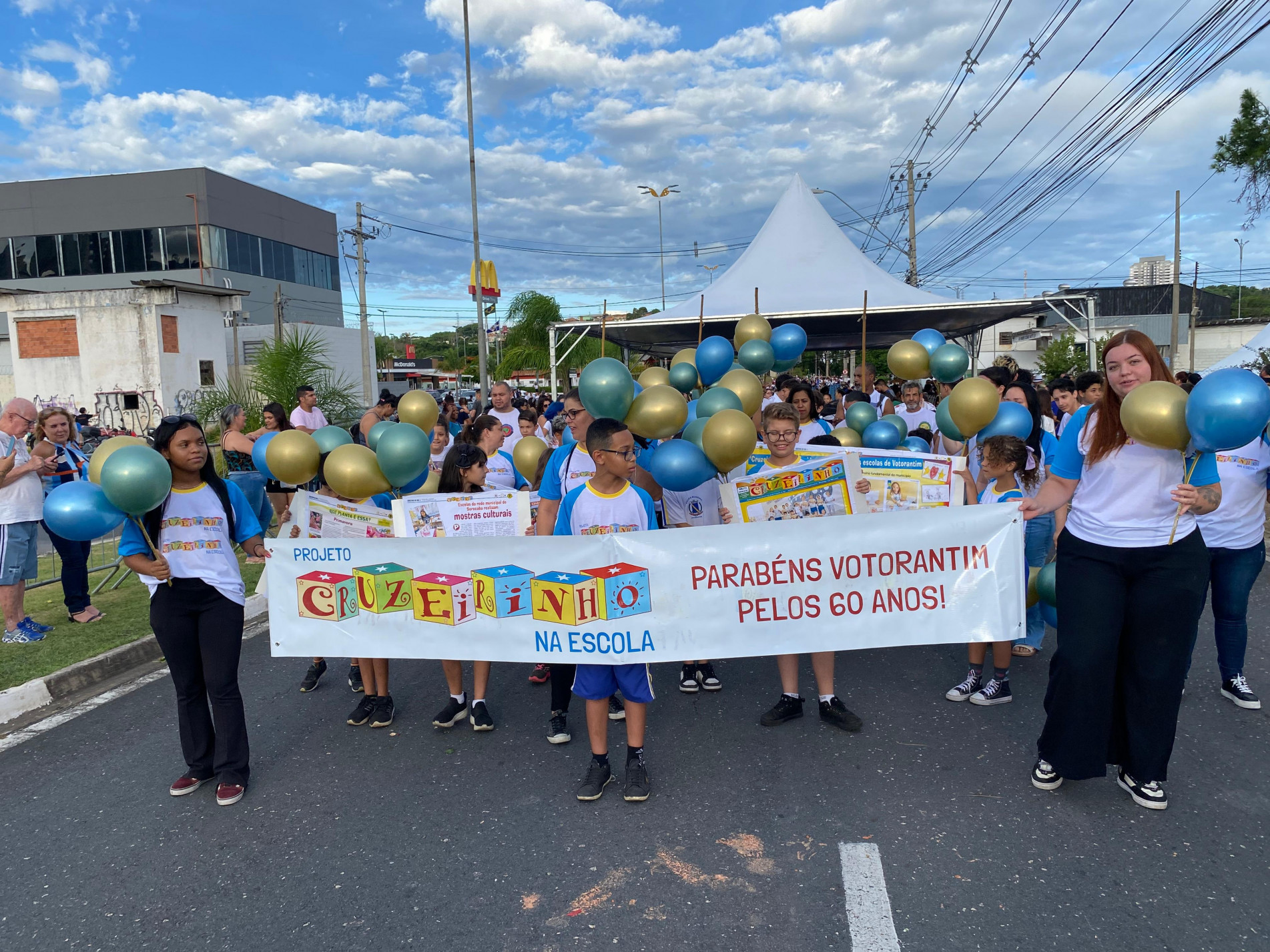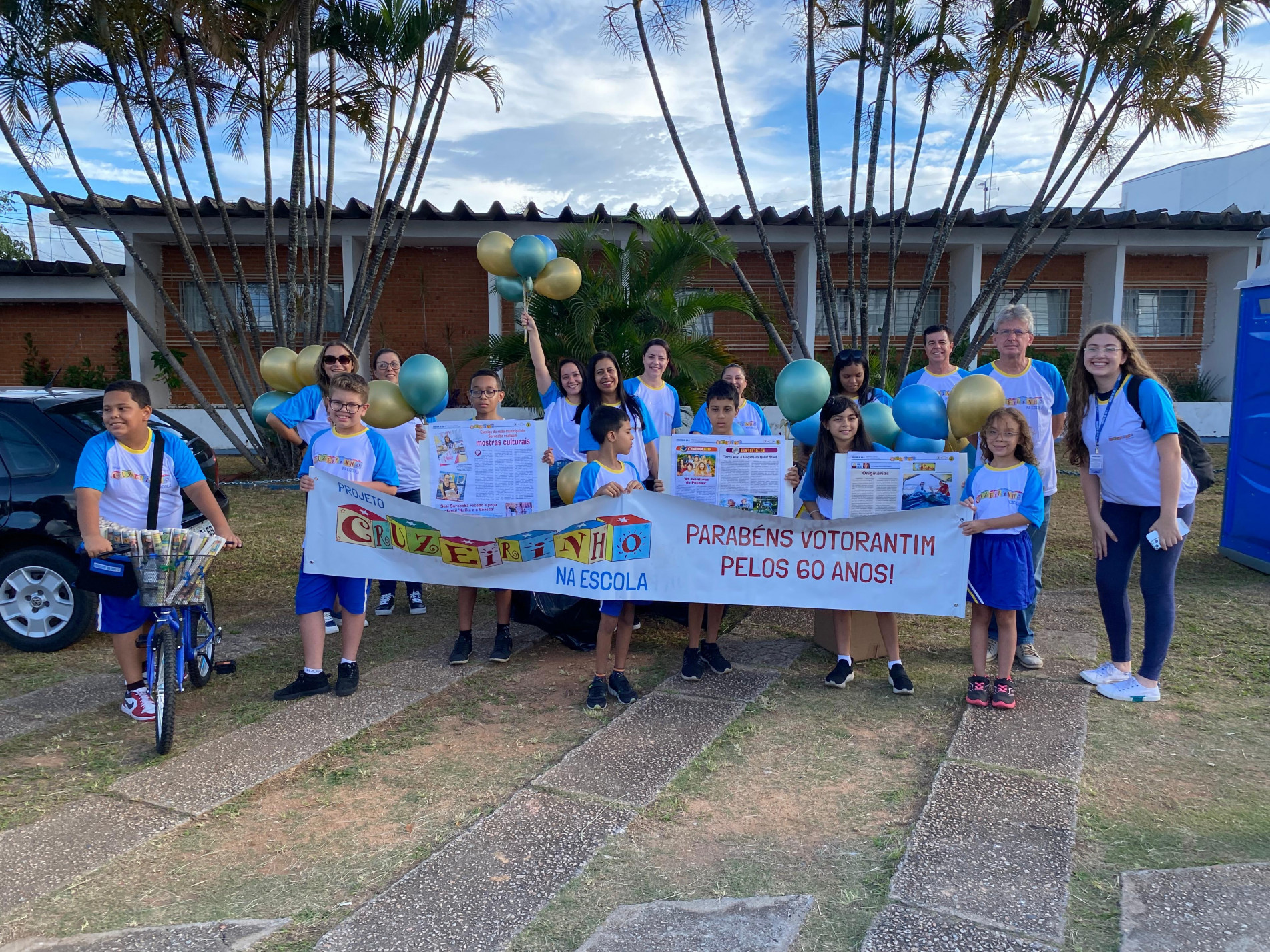 Os alunos, uniformizados com camisetas do projeto, carregavam faixas de felicitações, balões coloridos e grandes cópias de páginas do Cruzeirinho. Uma estudante de bicicleta distribuiu exemplares do jornal às autoridades, simbolizando a harmonia entre tradição e modernidade.