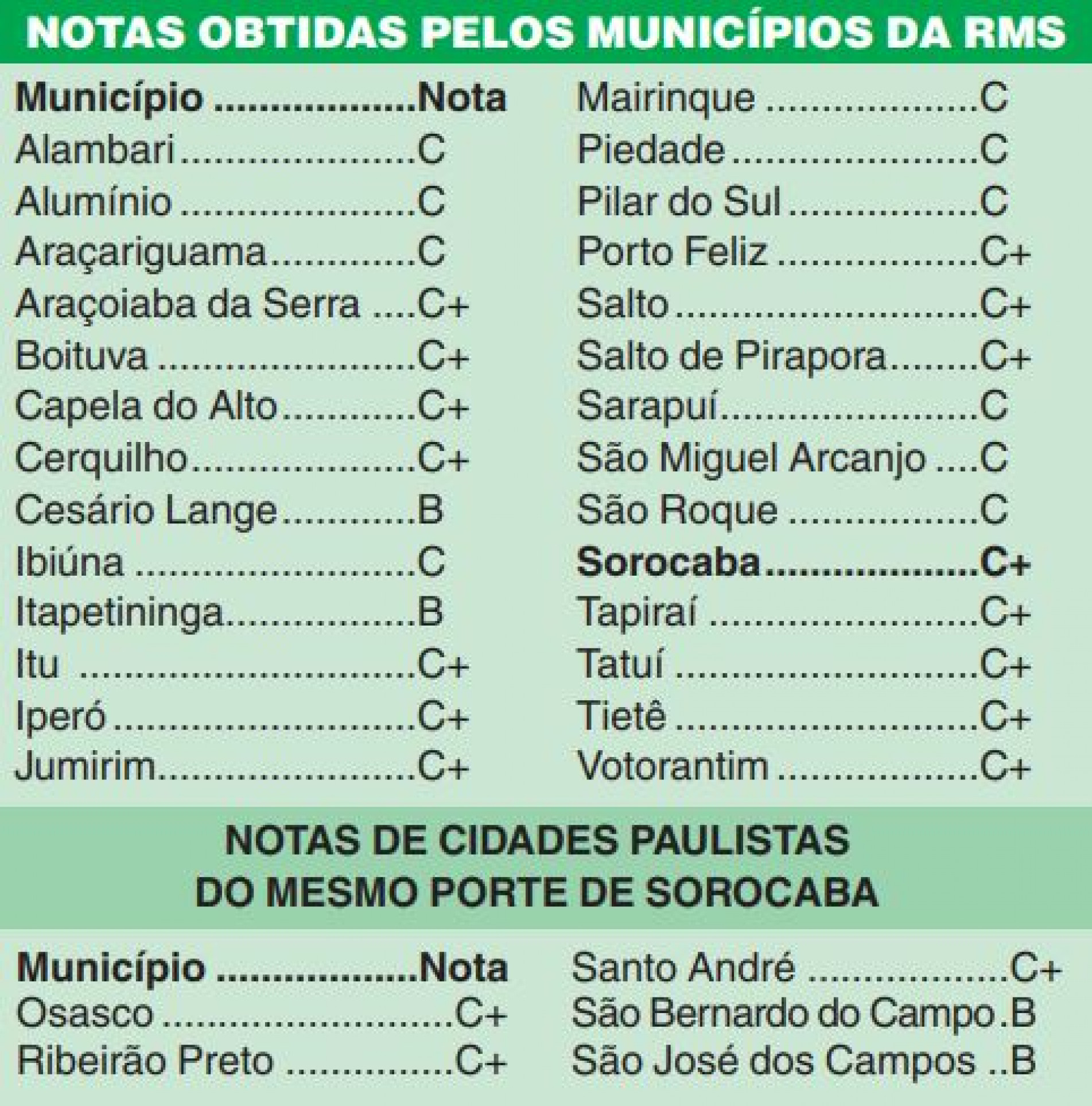 A avaliação é dividida em cinco notas: A (Altamente efetiva); B+ (muito efetiva), B (efetiva), C+ (em fase de adequação) e C (baixo nível de adequação). Dessa forma, pela análise do TCE, Sorocaba foi avaliada com notas C em Planejamento, B em Gestão Fiscal, C em Educação, C+ em Saúde, B em Meio Ambiente, B em Proteção aos Cidadãos e B em Governança e Tecnologia.