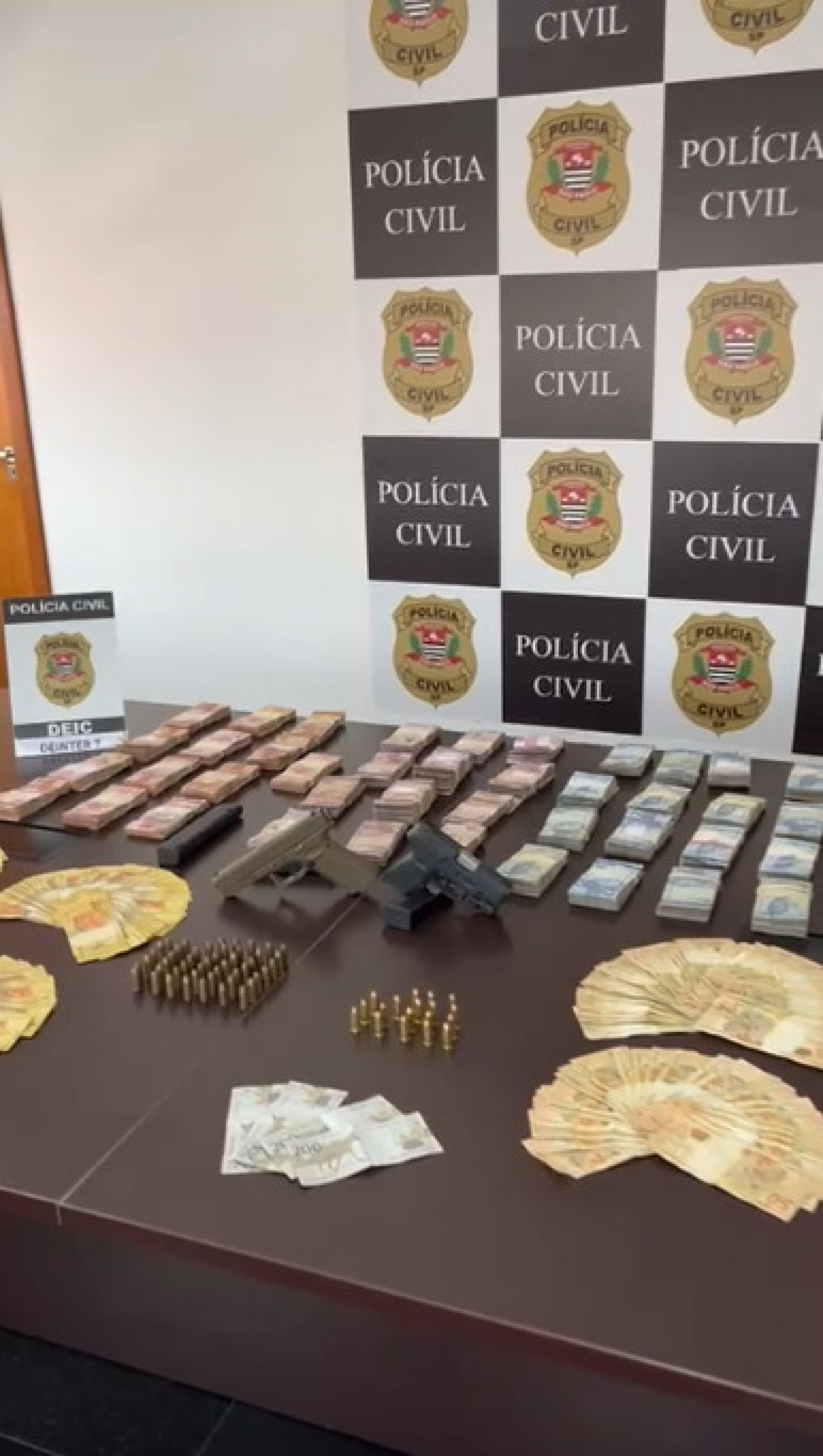 Durante o cumprimento dos mandados, dois suspeitos foram surpreendidos pela prática ilegal de arma de fogo. Uma das armas havia adaptador para disparo em rajada e um carregador alongada, fazendo com que seja um armamento modificado. No total, os policiais apreenderam duas armas calibre 9mm, três caminhões, um relógio de marca de alto padrão, diversas munições e R$47 mil reais.