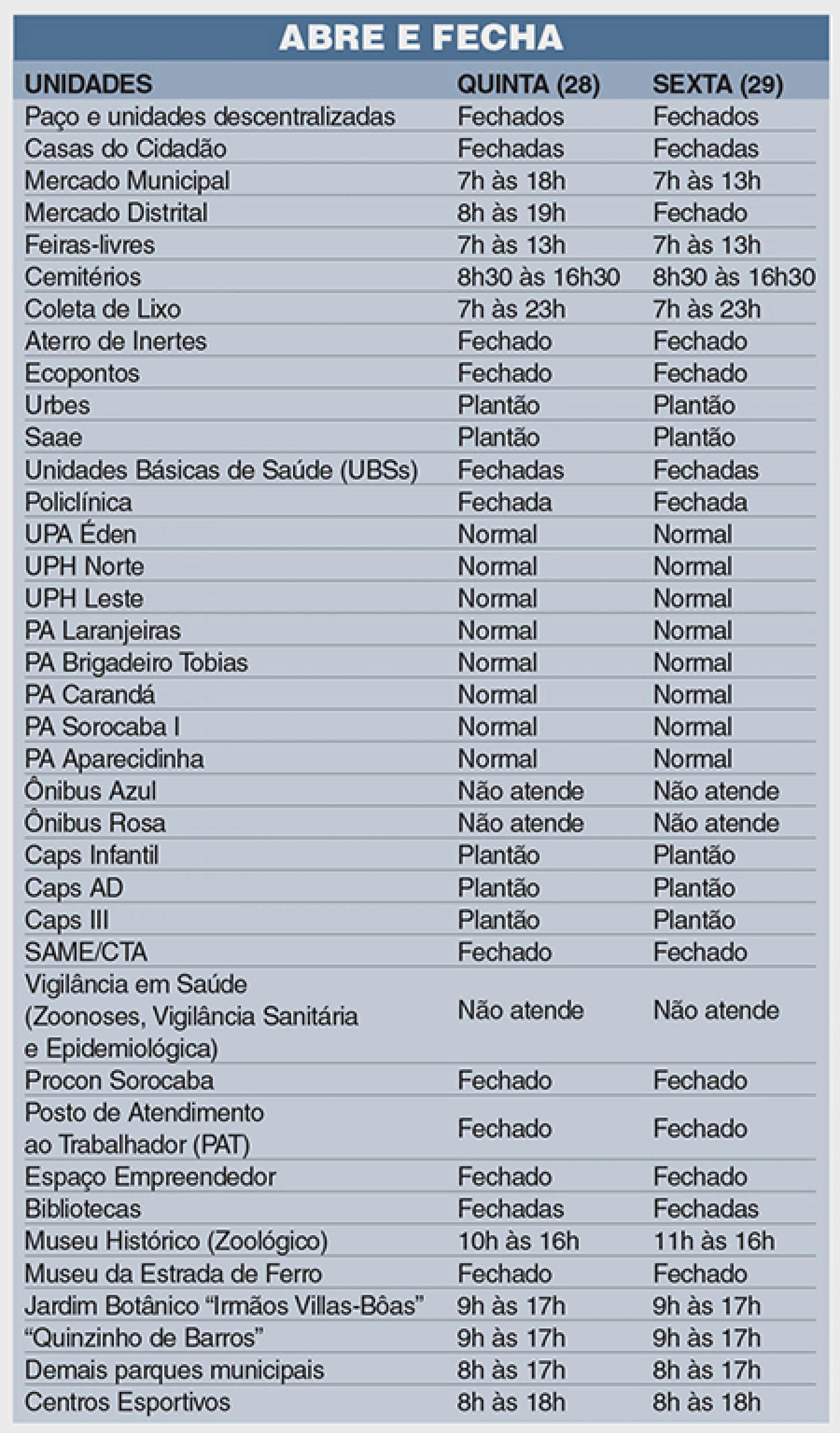 O feriadão da Semana Santa vai alterar a rotina de alguns serviços públicos oferecidos pela Prefeitura de Sorocaba a partir de amanhã (28). Além do feriado nacional de Sexta-feira da Paixão, comemorado no dia 29, a administração municipal decretou ponto facultativo nesta quinta-feira. Os dois dias ainda serão acrescidos do sábado e do domingo (30 e 31), ampliando o período de descanso ou esticando as viagens de quem pode pegar a estrada.
