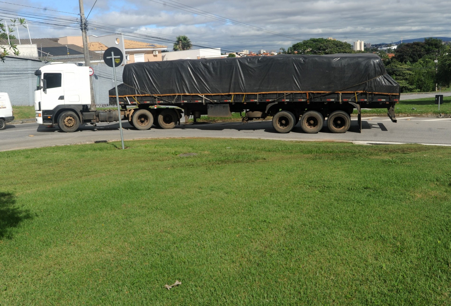 Uma carreta parada desde quarta-feira (17) à noite, na rotatória da avenida São Paulo próximo às entradas do Jardim do Sol e do condominio Granja Olga, está causando transtornos a quem transita naquela região. Nesta quinta-feira (18), no horário de pico, por volta das 7h, o trânsito foi intenso e o motorista precisou procurar vias alternativas.