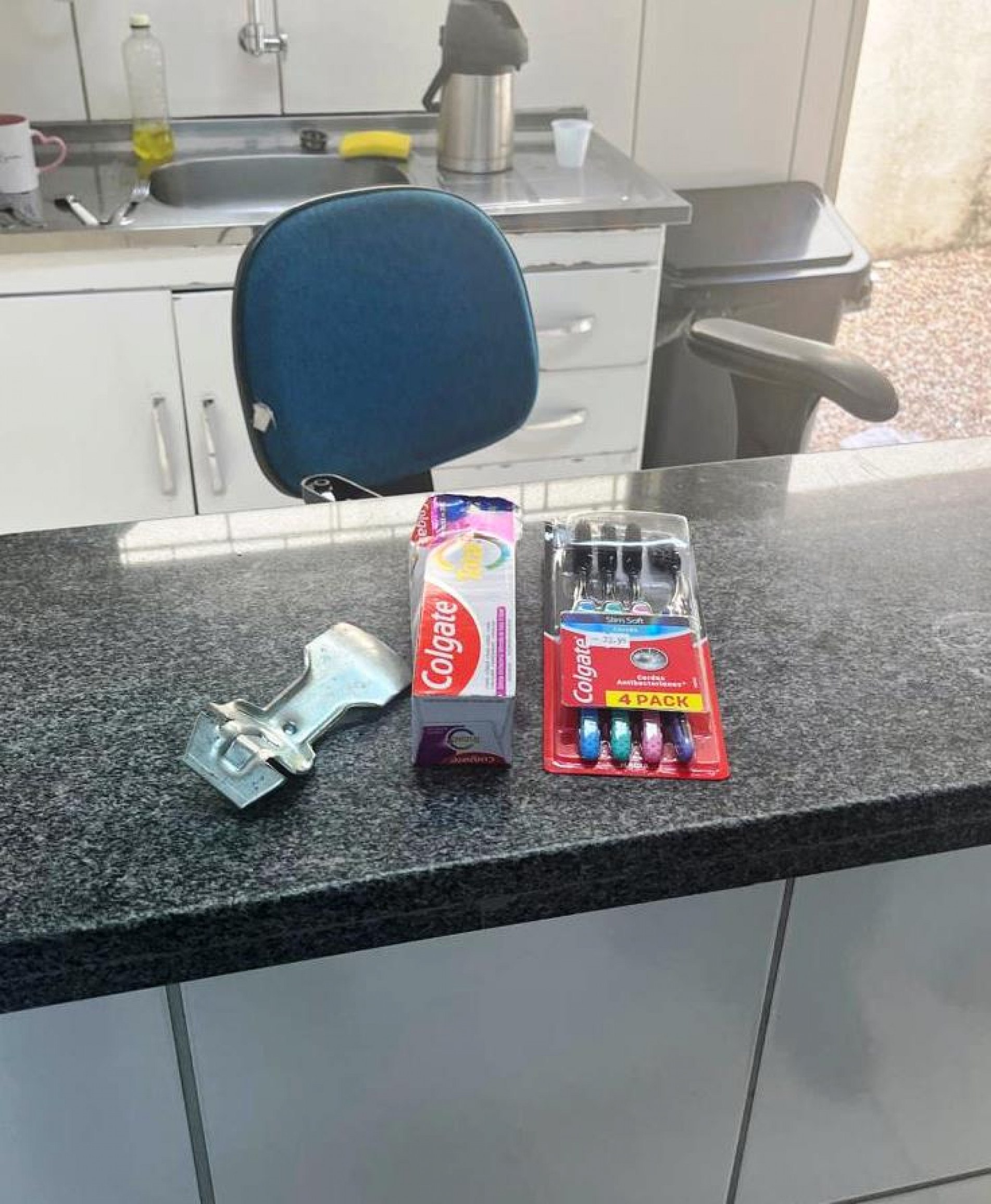 Os policiais solicitaram que a mulher liberasse a refém, o que foi feito sem resistência. Com ela foi encontrado um objeto de metal, utilizado para simular a arma de fogo, além de um tubo de creme dental e um kit com escovas de dente. A suspeita chegou a pedir para ir ao banheiro, tentou fugir, mas foi detida.