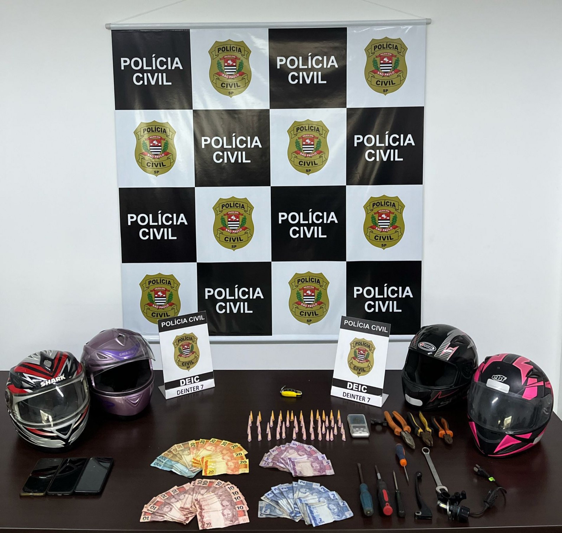 No total, os policiais civis apreenderam R$ 1.171,00 em dinheiro, balanças de precisão, capacetes, chaves micha (instrumentos utilizados para ligar as motos), ferramentas, celulares e 48 porções de crack.