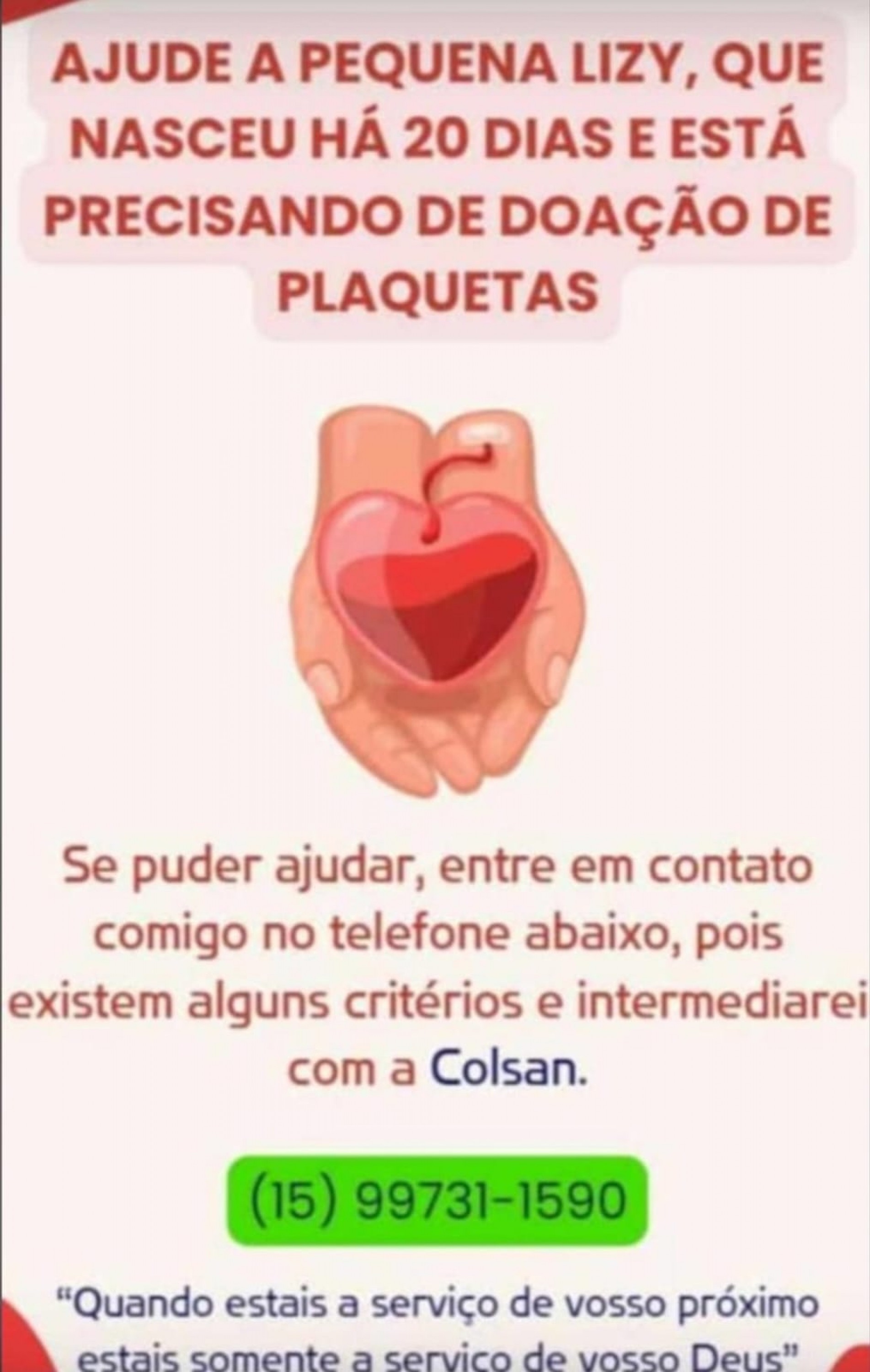Amigos da família de uma bebê que completa um mês neste sábado (8) estão se mobilizando para conseguir doadores de sangue. Lizy não produz plaquetas e precisa urgentemente de doações até que os resultados dos exames médicos possam ajudar no tratamento.