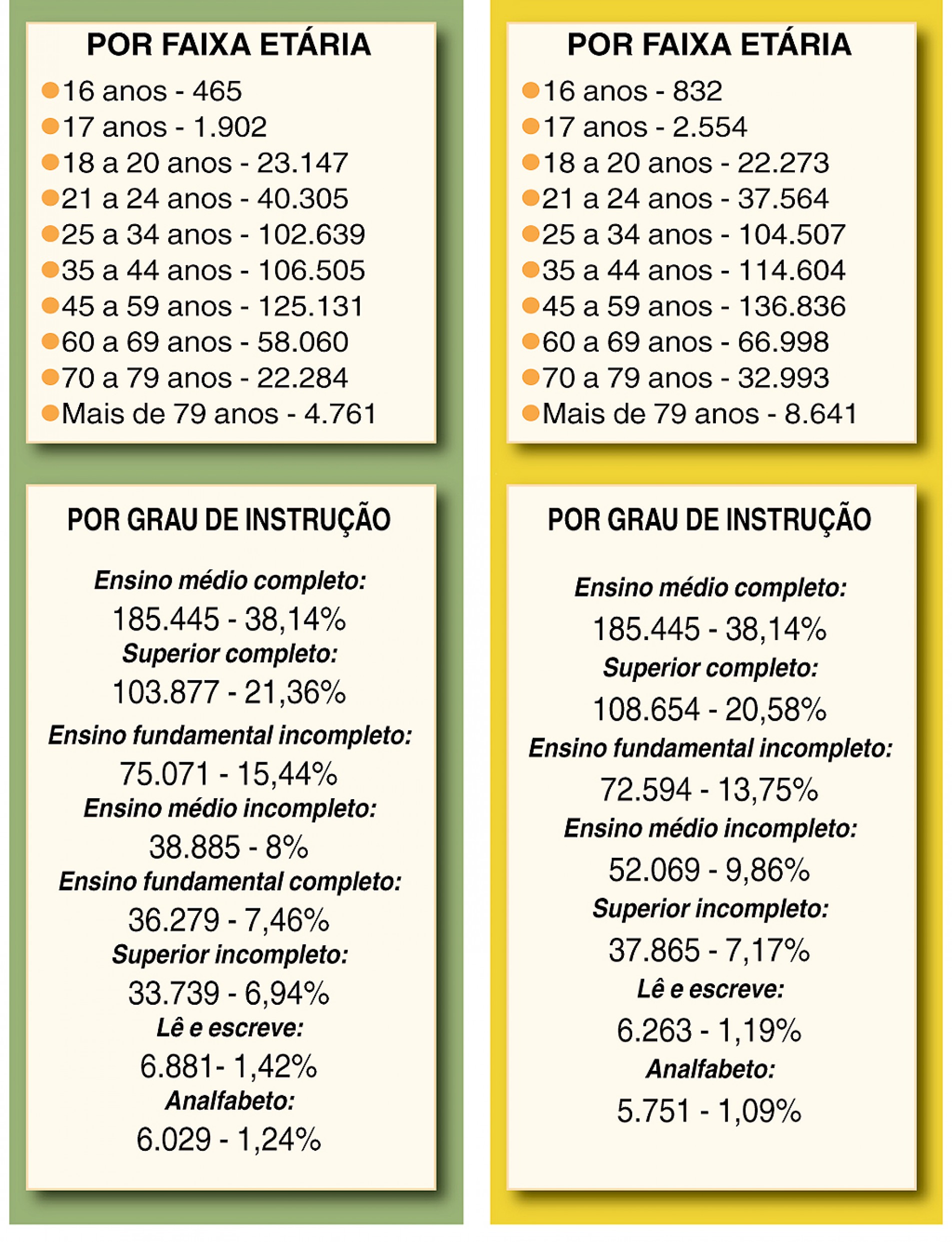 Com 125.131 representantes em 2020, o grupo de 45 a 59 anos tinha o maior número de votantes em 2020 e continua na liderança em 2024, com 136.836. Quanto à escolaridade, a maioria — 207.984 (39,4%) — possui ensino médio completo. O cenário era o mesmo quatro anos atrás, com 185.445 (38,14%).