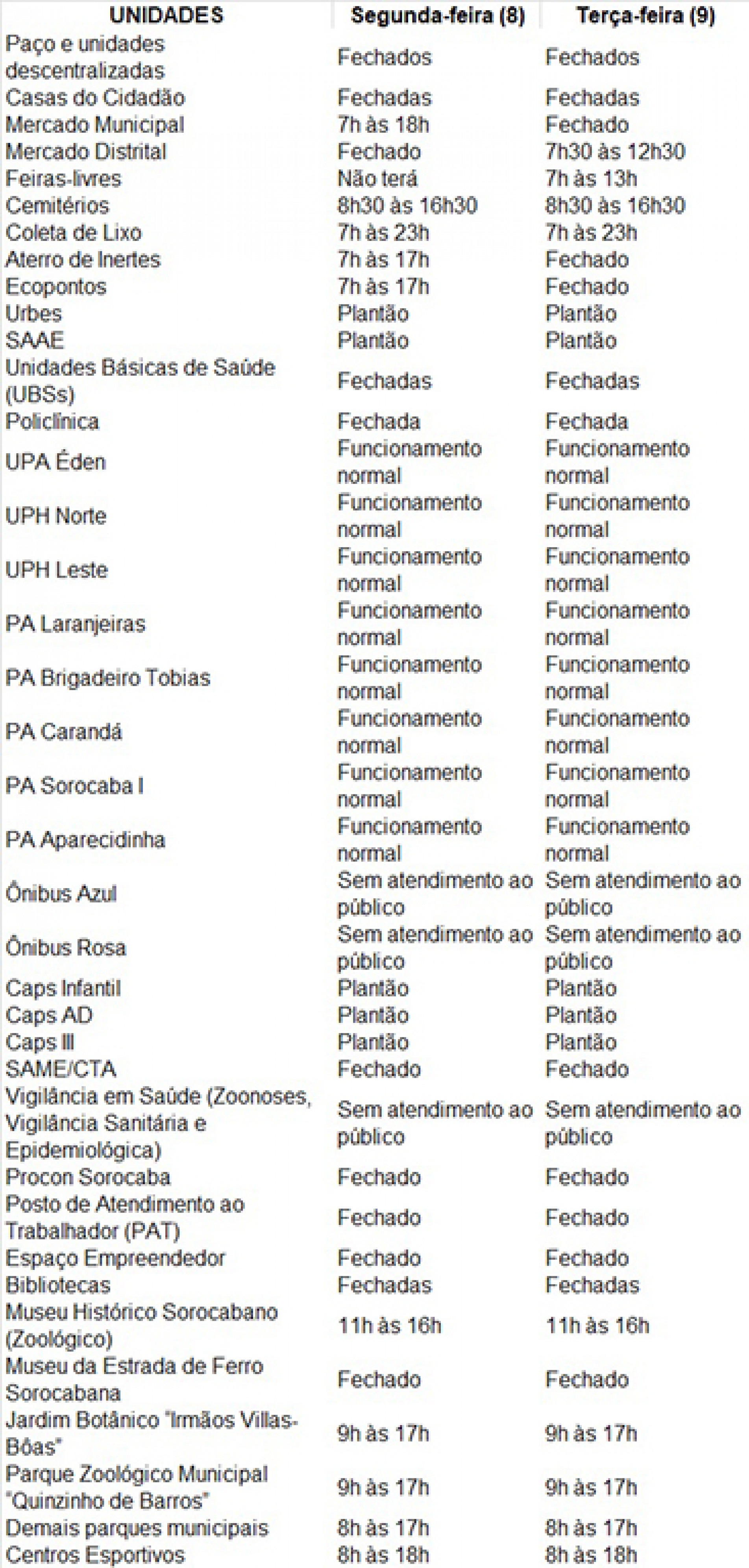 Outros serviços públicos, ainda, seguem funcionando em esquema de plantão, como os do Saae/Sorocaba e da Urbes Trânsito e Transportes. Confira abaixo. (Da Redação)