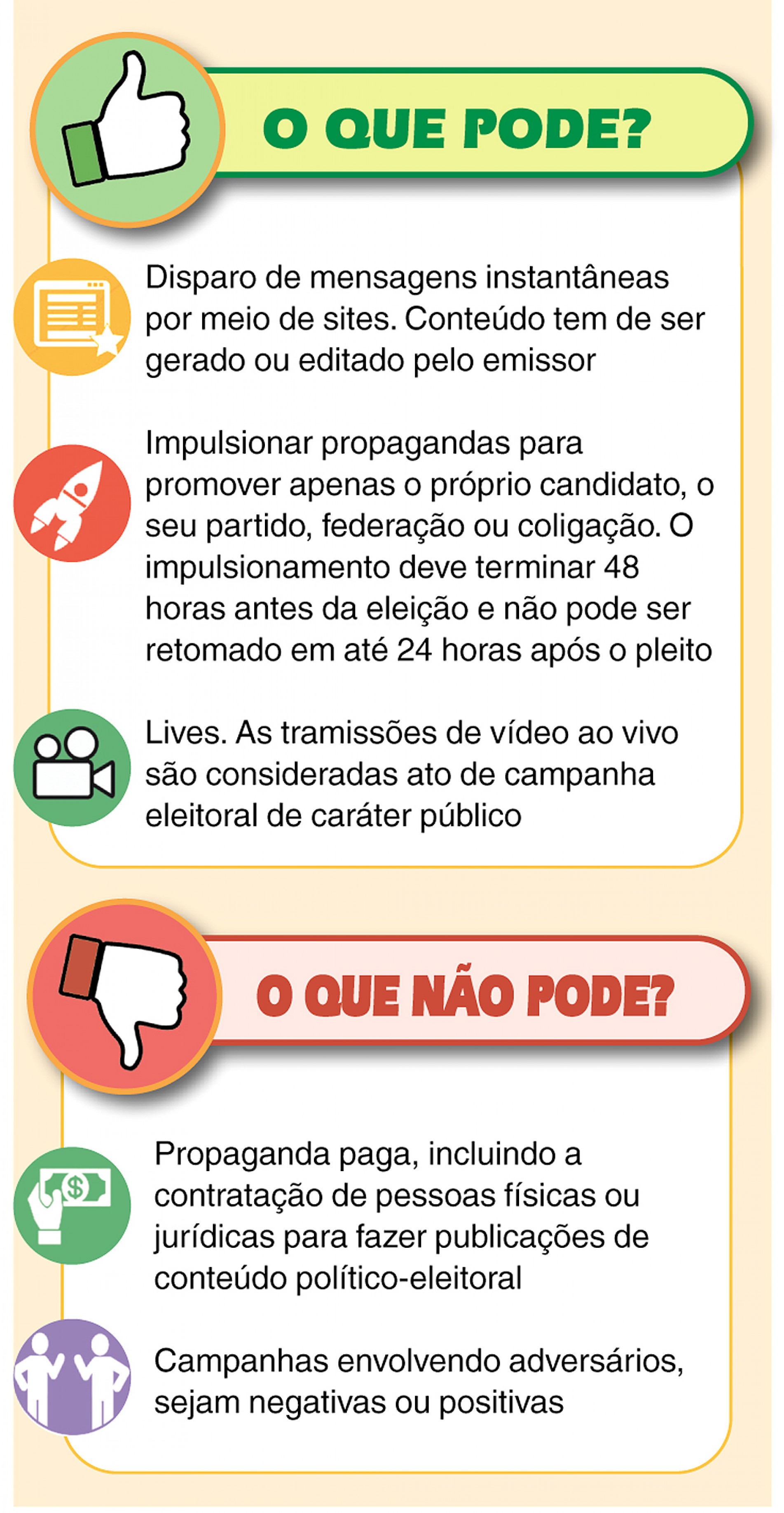 A Justiça Eleitoral também possui outras regras gerais para a propaganda eleitoral na internet. As campanhas podem ser realizadas em blogs, páginas ou mídias sociais de candidatos, partidos, coligações ou federações.