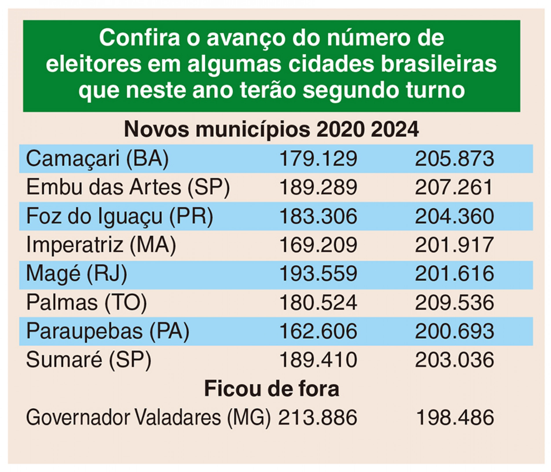 Em Palmas (TO), a quantidade de pessoas aptas a votar cresceu de 180.524 para 209.536 em quatro anos. O eleitorado de Camaçari (BA) passou de 179.129 para 205.873. Foz do Iguaçu (PR) soma 204.360 eleitores em 2024, enquanto, em 2020, eram 183.306. Em Imperatriz (MA), 201.917 estão cadastradas para ir às urnas dessa vez; na eleição passada, foram 169.209.