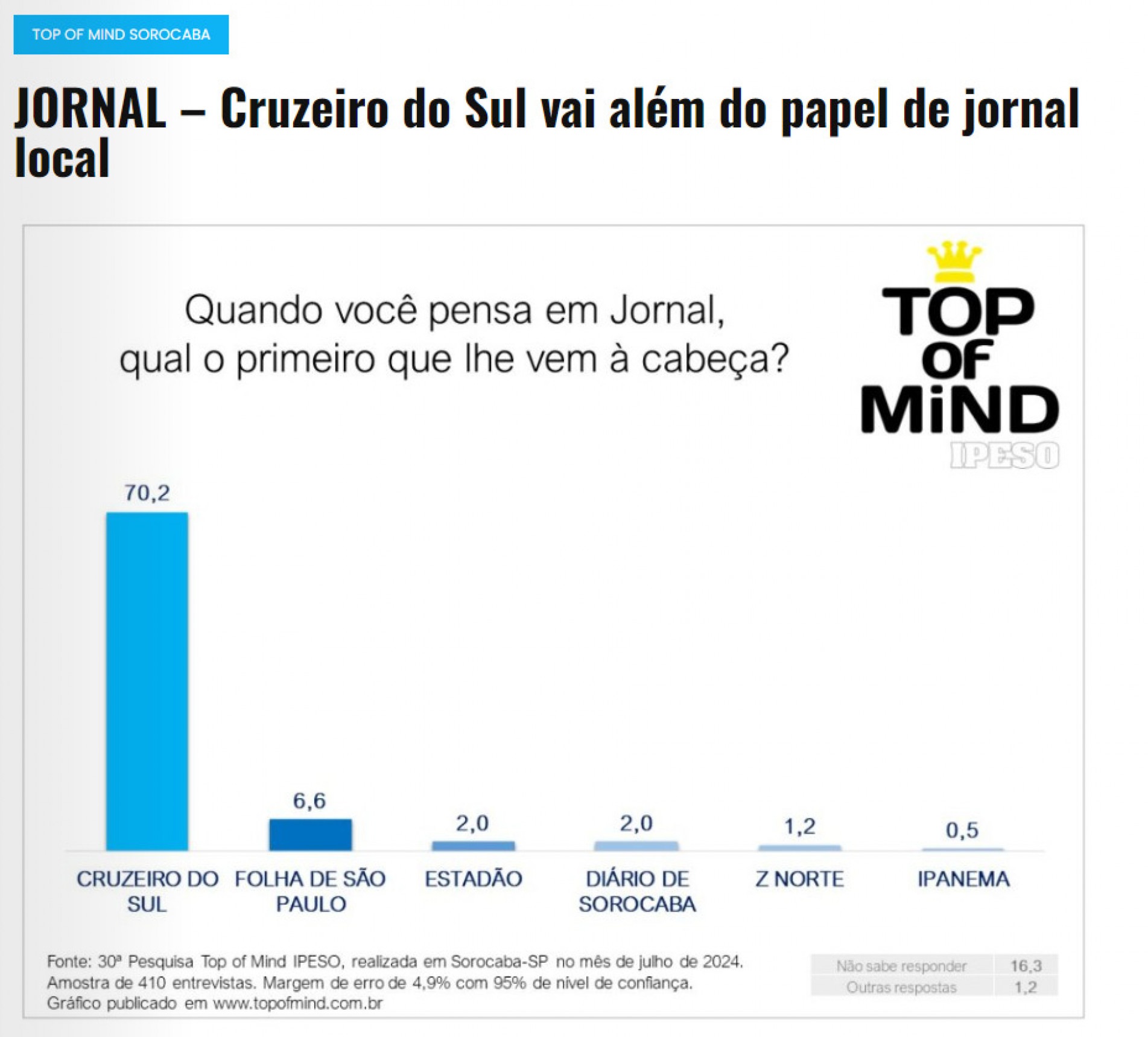 O Cruzeiro do Sul, mantido pela Fundação Ubaldino do Amaral (FUA), é o jornal mais lembrado pelos sorocabanos, segundo os resultados da 30ª edição da pesquisa Top of Mind, do Instituto de Pesquisa de Sorocaba (Ipeso). O impresso ainda alcançou a segunda posição entre as marcas mais lembradas da cidade, atrás somente da funerária Ossel.