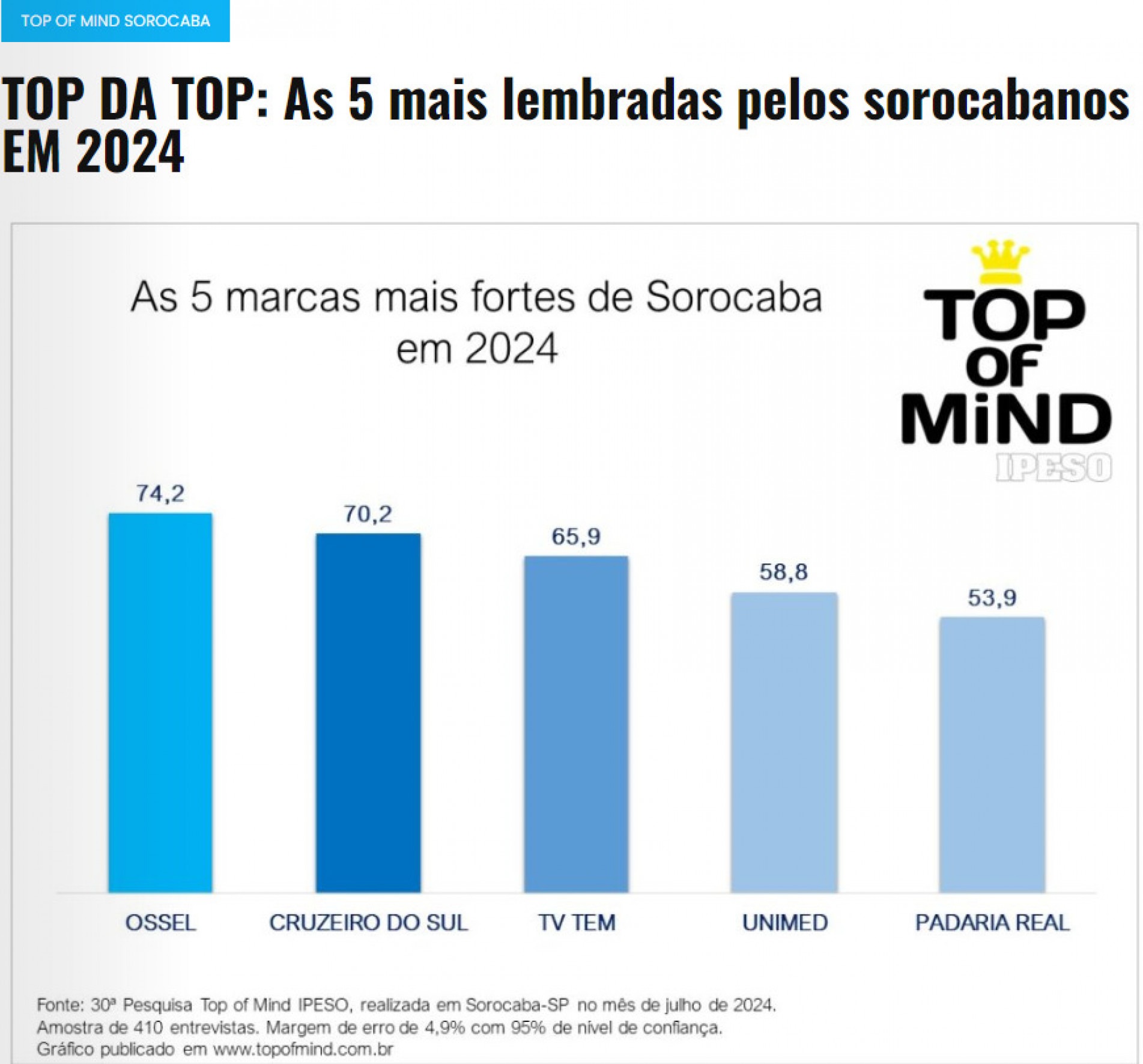 O Top of Mind abrange categorias desde planos de saúde liderado pela Unimed , até padarias com a Padaria Real em primeiro lugar. No segmento jornal, o Cruzeiro do Sul está presente na lembrança de 70,2% dos entrevistados, a segunda maior pontuação entre todas as divisões.