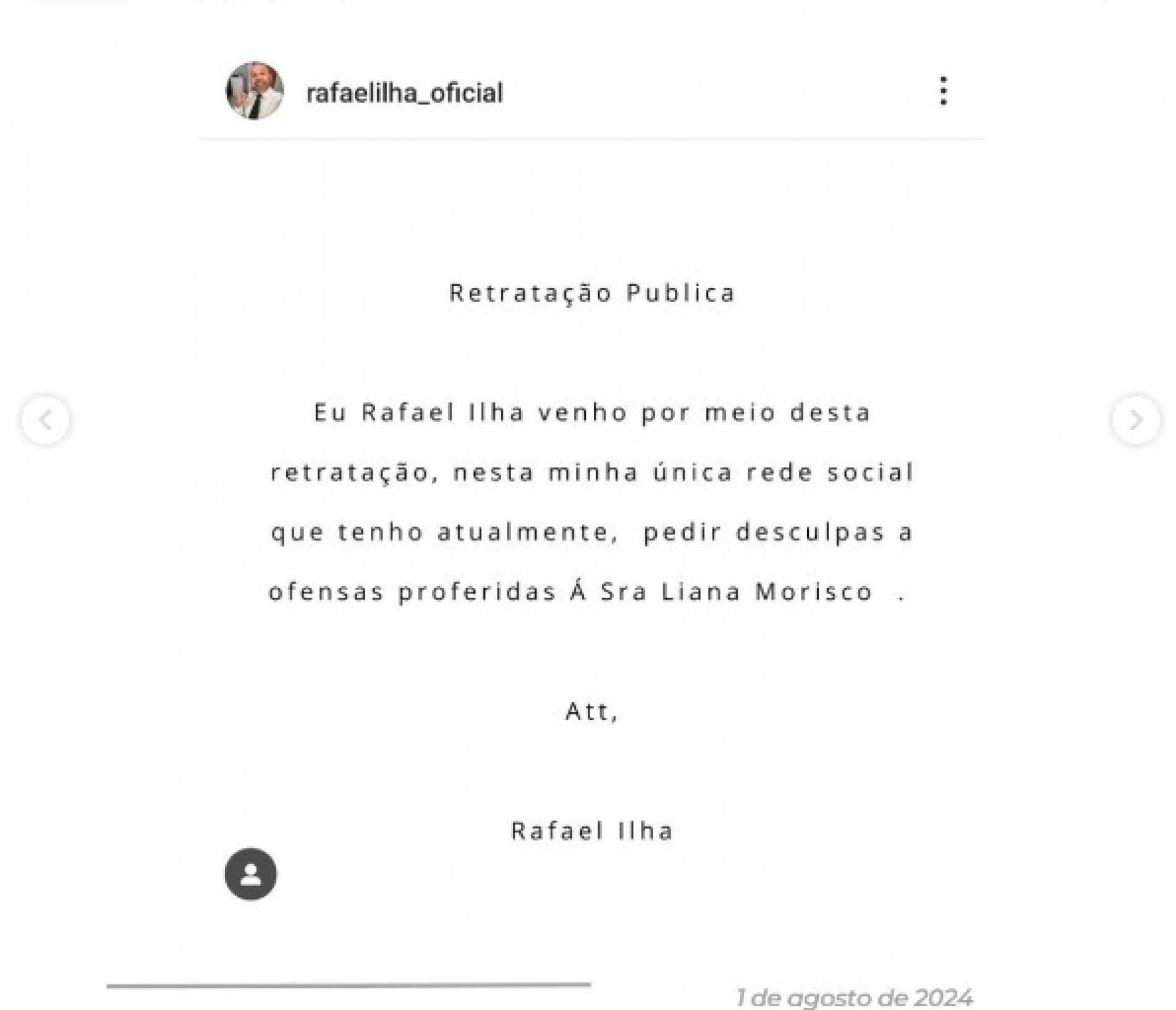 A retratação pública foi publicada no Instagram nesta quinta-feira (1). No post, ele pede desculpa pelas ofensas. “Eu, Rafael Ilha, venho por meio desta retratação, nesta única rede social que tenho atualmente, pedir desculpas a ofensas proferidas À Senhora Liana Morisco.”