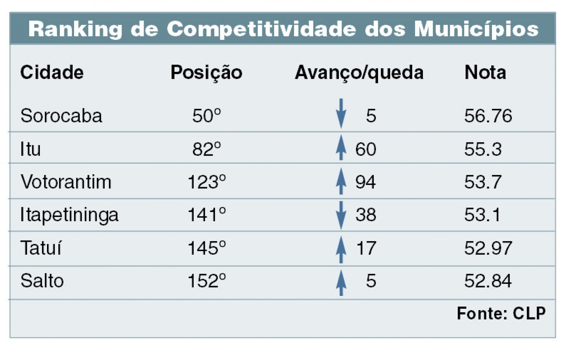 Em um ano, Sorocaba caiu cinco posições no Ranking de Competitividade dos Municípios, elaborado pelo Centro de Liderança Pública (CLP), ficando em 50º. Outras cidades da região que também caíram foram Itapetininga e Tatuí. Já Itu, Votorantim e Salto apresentaram avanço no mesmo período. O levantamento analisa dados de 404 municípios do País com mais de 80 mil habitantes.