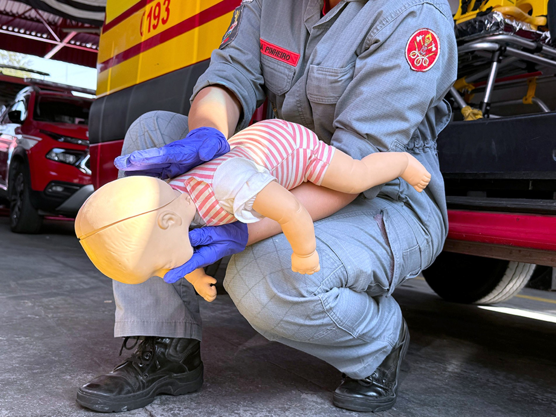 Cabo Elmo explicou o passo a passo do procedimento: “Colocar o bebê no antebraço, rosto virado para baixo, fazer o V com os dois dedos, o indicador e o médio, colocar no queixo, liberar as vias aéreas, ou seja, a faringe, para que entre o oxigênio, e os cinco tapinhas de expulsão”.
