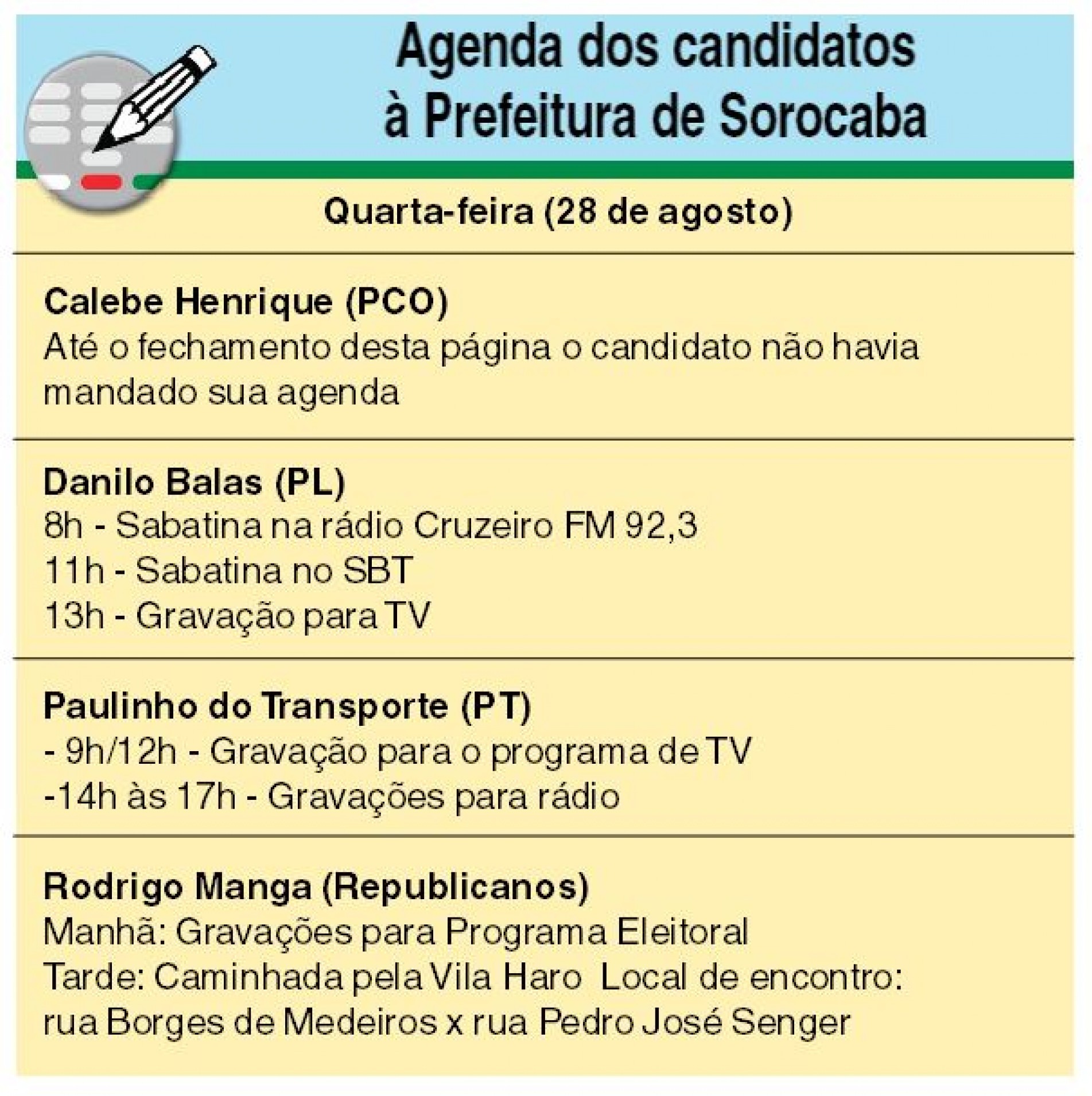 Eleições 2024 Agenda dos candidatos à Prefeitura de Sorocaba 27 de Agosto de 2024 às 23:27 Cruzeiro do Sul [email protected] .. (Crédito: DIVULGAÇÃO) .. (crédito: DIVULGAÇÃO)