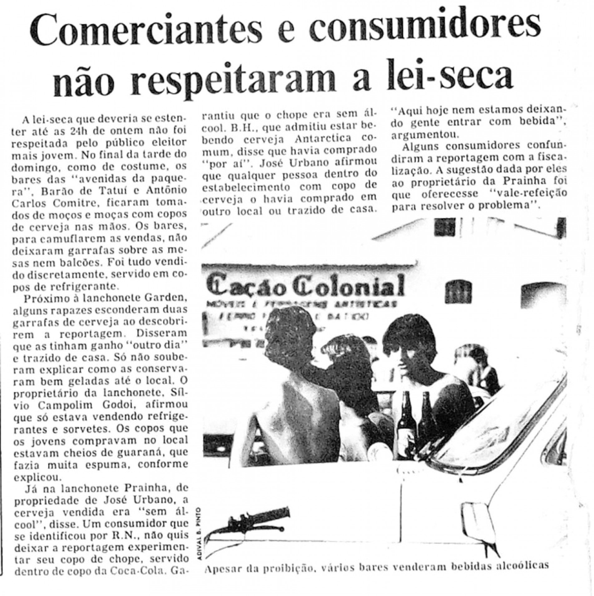 Há mais de 30 anos, na edição de 17 de novembro de 1992, um dia após o segundo turno da eleição municipal que elegeu Paulo Mendes prefeito de Sorocaba, o Cruzeiro do Sul noticiava que consumidores e comerciantes não respeitaram a Lei Seca. Na ocasião, alguns jovens se reuniram com copos de bebidas alcoólicas. Já os bares, venderam as bebidas discretamente, em copos de refrigerantes. A reportagem flagrou a ação que era proibida devido a votação. Décadas se passaram, a sociedade mudou, e algumas regras válidas durante o período de eleições também foram modificadas. A proibição do uso de bebidas alcoólicas no dia da eleição, por exemplo, a cada ano perde mais força. Atualmente, a regra varia e é estabelecida por cada Estado do País.