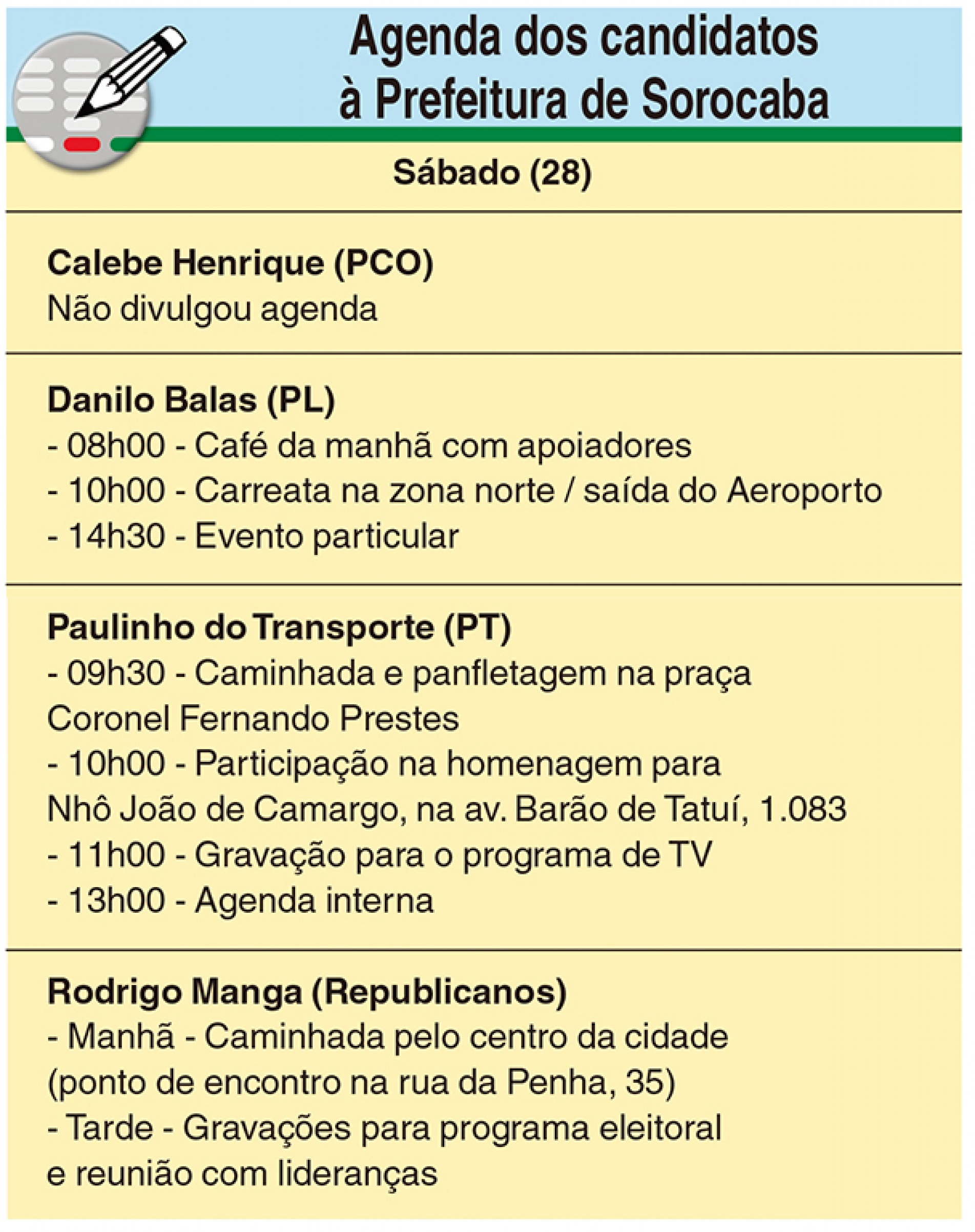 Eleições 2024 Agenda dos candidatos à Prefeitura de Sorocaba 27 de Setembro de 2024 às 22:00 Cruzeiro do Sul [email protected] . (Crédito: .)