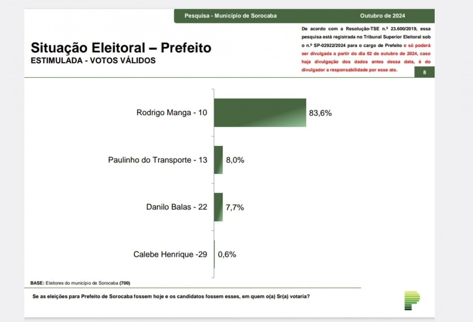 Segundo o Instituto Paraná de Pesquisas, que divulgou, nesta quarta-feira (2), uma nova pesquisa estimulada para prefeito de Sorocaba, o atual chefe do Executivo e candidato à reeleição, Rodrigo Manga (Republicanos), lidera com 74,4% das intenções de voto. Paulinho do Transporte (PT) aparece em segundo lugar, com 7,1%; Danilo Balas (PL) em terceiro, com 6,9%; e Calebe Henrique (PCO) em quarto, com 0,6%.