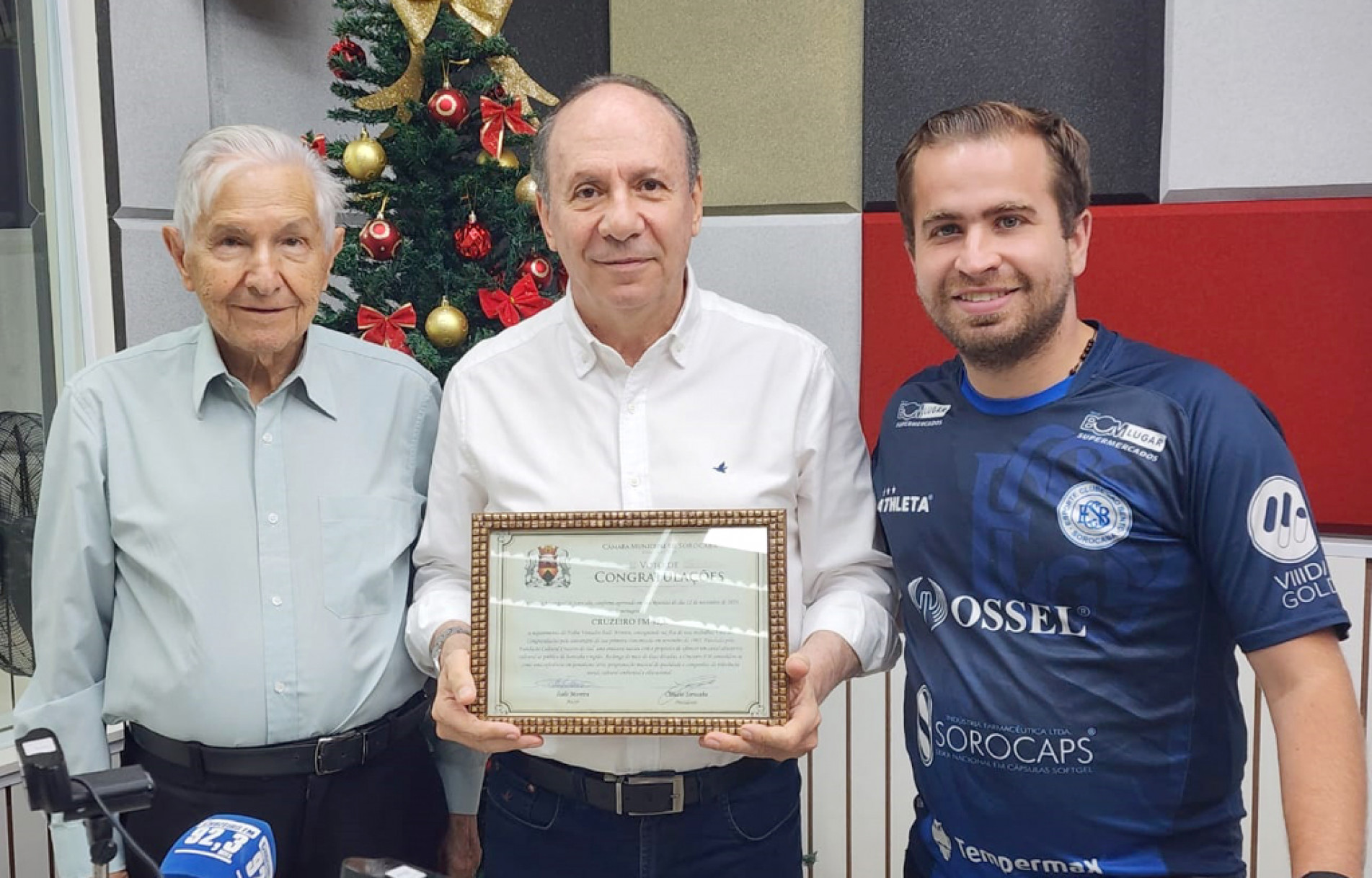 O vereador Ítalo Moreira (União Brasil) entregou, na tarde de ontem (11), uma homenagem à rádio Cruzeiro FM 92,3, mantida pela Fundação Cultural Cruzeiro do Sul, pela passagem dos 29 anos da primeira transmissão feita pela emissora, em novembro de 1995. O Voto de Congratulações, aprovado por unanimidade na Câmara de Sorocaba, foi entregue, emoldurado, ao presidente da Diretoria Executiva da Fundação, o empresário Alexandre Latuf, e ao presidente do Conselho Superior da Fundação, Laelso Rodrigues, nas instalações da própria emissora, no Alto da Boa Vista.