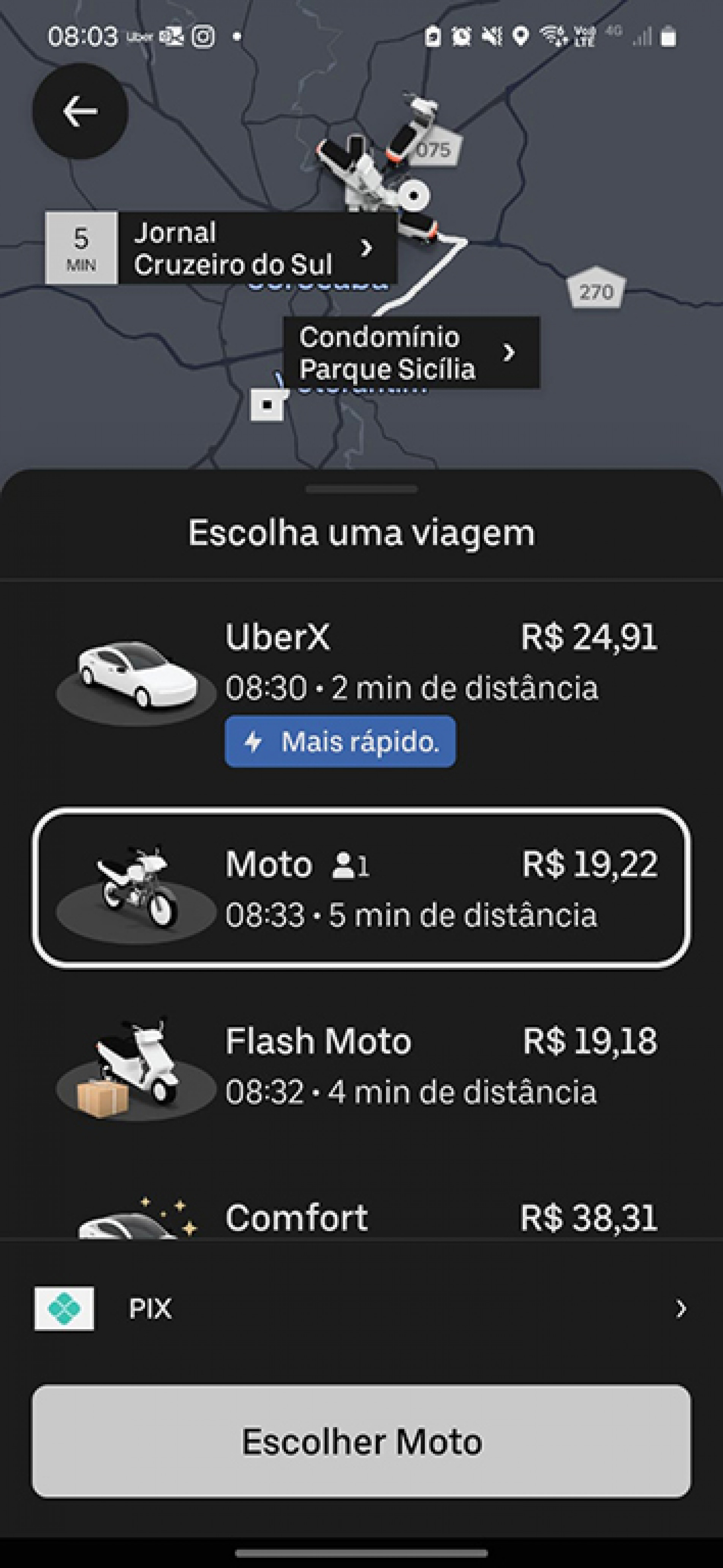 R$ 24,91, com automóvel. Pelo 99, ficou em R$ 17,10 na moto e R$ 26,60 de carro. Segundo usuários dos aplicativos, a diferença de preço em horários de pico é o grande atrativo, muitas vezes com diferença de R$ 10.