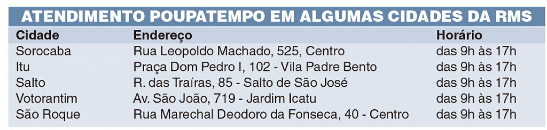 Moradores de Araçariguama, Boituva, Capela do Alto, Iperó, Salto e Taquarituba, por exemplo, podem solicitar alguns serviços municipais diretamente pelo Poupatempo. Entre os serviços disponíveis estão a consulta de débitos, emissão de IPTU, alvará de funcionamento, Junta Militar e seguro-desemprego. (Da Redação)