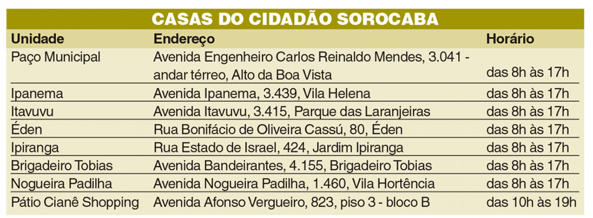 Para conferir todos os serviços ofertados nas unidades da Casa do Cidadão e verificar os documentos necessários para cada solicitação, acesse: https://fazenda.sorocaba.sp.gov.br/casadocidadao/. (Da Redação)