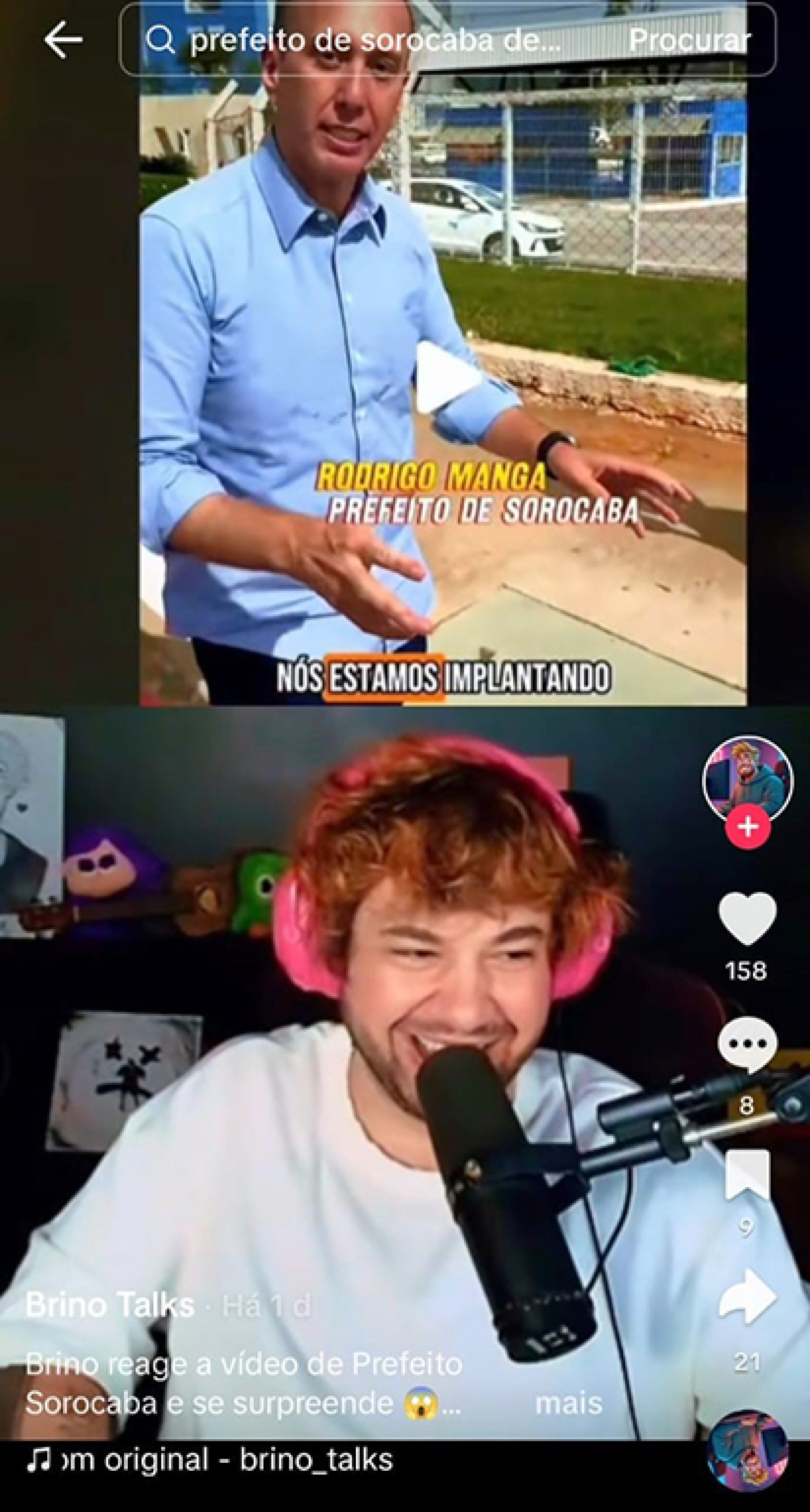 O prefeito de Sorocaba, Rodrigo Manga (Republicanos), que faz vídeos de humor para divulgar as ações da prefeitura nas redes sociais, viralizou no TikTok e no Instagram. Nas últimas semanas, diversos influenciadores compartilharam ou criaram conteúdos mencionando a cidade. Entre eles está Lucas Rangel, que acumula quase 50 milhões de seguidores nas duas redes.