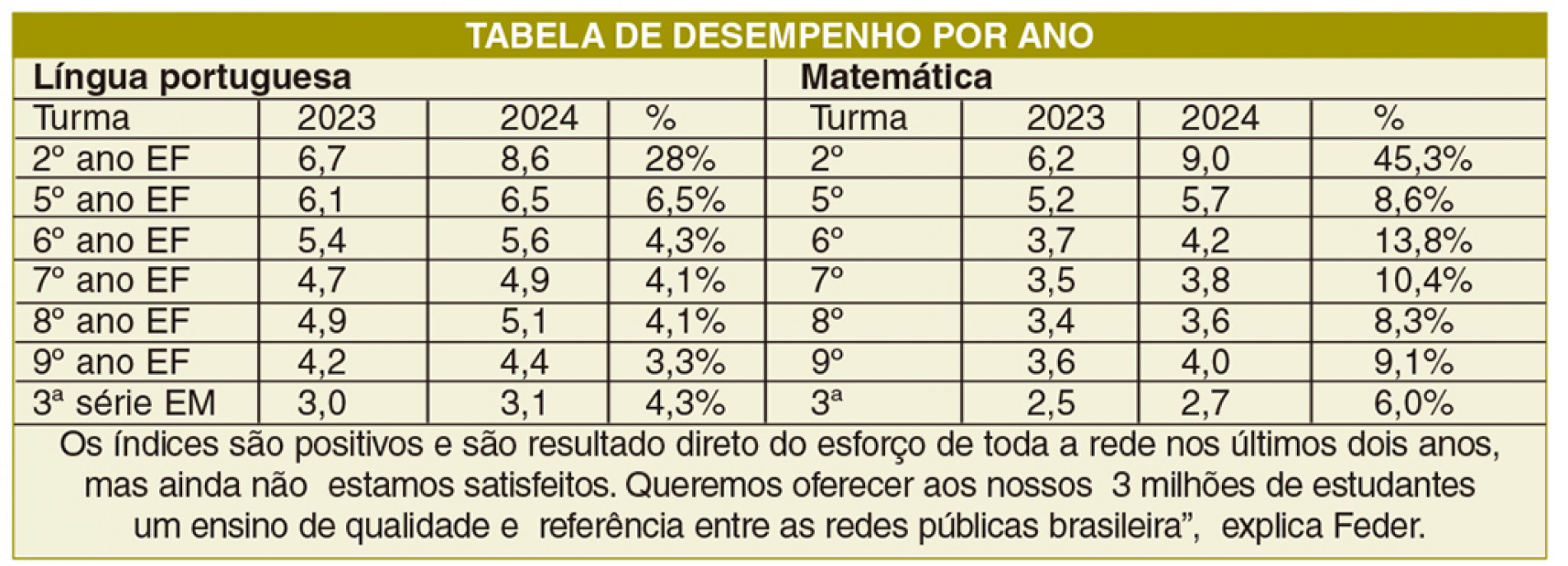 Além do resultado em matemática, com notas que passaram de 6,2 em 2023 para 9 em 2024, no 2º ano do Ensino Fundamental, a nota de língua portuguesa passou de 6,7 em 2023 para 8,6 em 2024, um aumento de 28% nos resultados. Com isso, na rede estadual, 65,8% dos estudantes se encontram no nível avançado em língua portuguesa, contra 50,7% da última avaliação (29,8% estão no nível adequado, 3,4% no básico e apenas 1% no nível abaixo do básico).