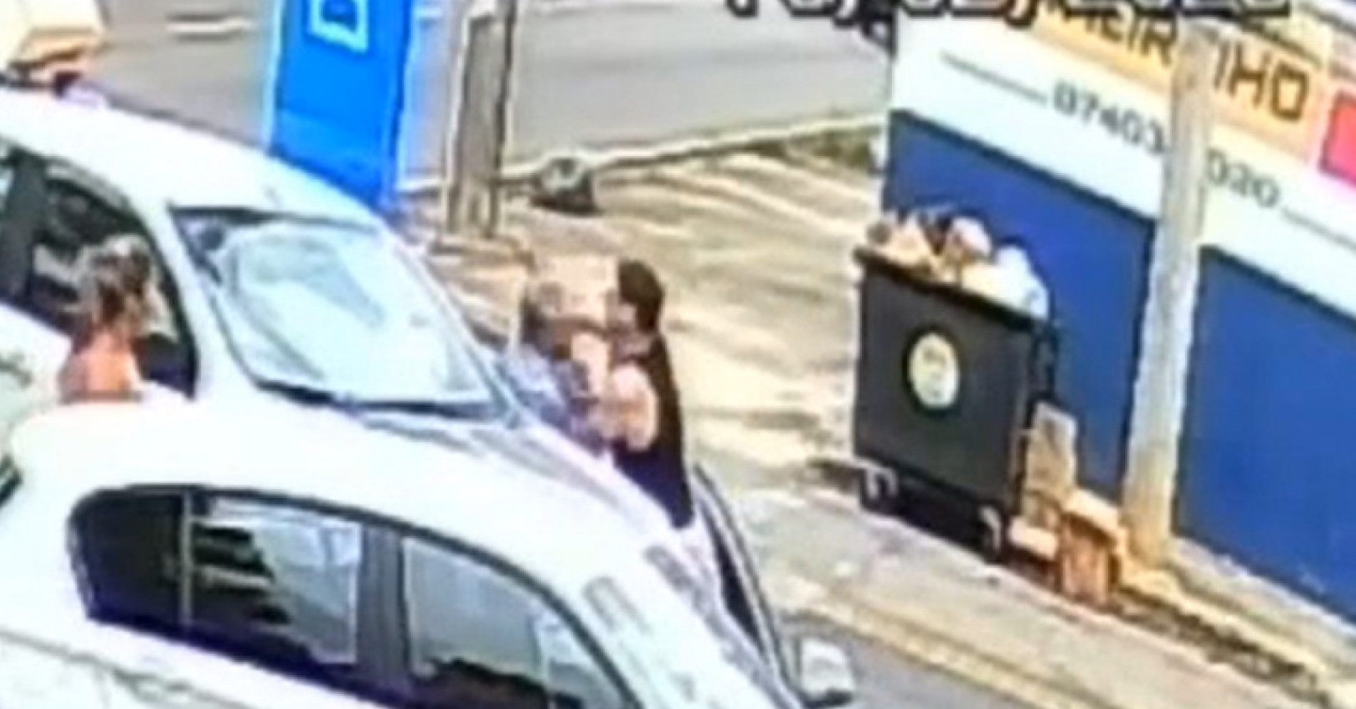 Assim que sai da caminhonete, o motorista é agredido com um soco no rosto, cai e bate a cabeça no veículo. Mesmo no chão, ainda leva ao menos um chute. A noiva dele também desce com o intuito de afastar o suspeito. Em seguida, outro homem aparece para tentar contê-lo.