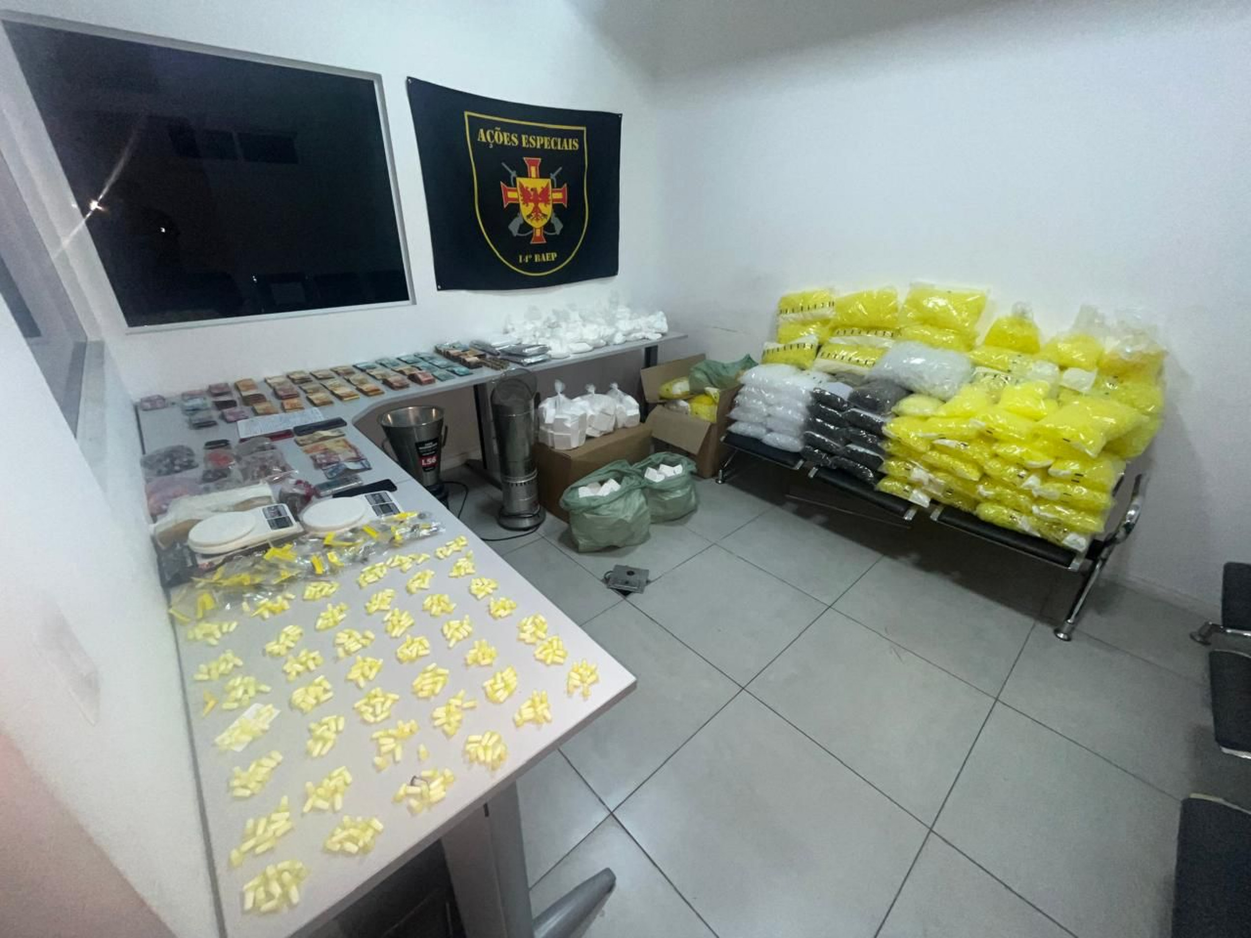 A investigação levou a um ponto utilizado para armazenar entorpecentes, onde foram encontrados 28,963 quilos de drogas, incluindo 531 porções e 35 sacos de cocaína, 1 tijolo e 58 porções de maconha, 1 saco de “K9”, 109 porções de crack, 5 sacos de mistura para cocaína, 4 pacotes de tetracaína, além de objetos utilizados para a comercialização dos produtos, como 4 balanças de precisão, 3 celulares, 96 mil eppendorfs vazios, 25 mil embalagens amarelas, 2 liquidificadores industriais, 2 peneiras e R$ 36.439,00 em espécie. O veículo era utilizado para o transporte das drogas.