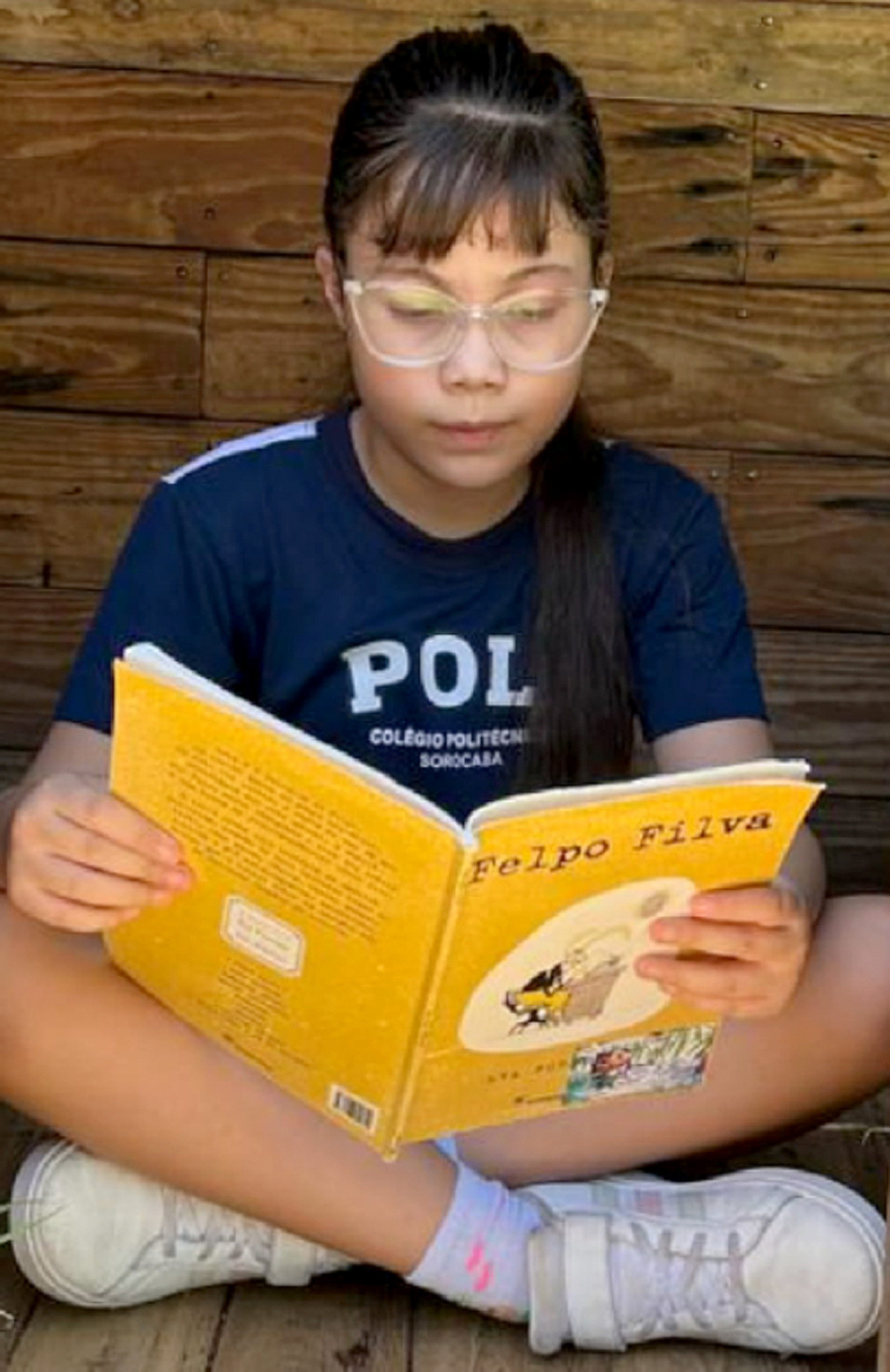 “O projeto de leitura, ao ar livre junto aos amigos, foi muito divertido. O livro é muito engraçado, cada página uma nova descoberta e nos faz viajar na história. A parte que mais gostei foi que a Charlô envia para o Felpo uma carta com sugestões mudando a história triste do Felpo para um final feliz. Quando criança, Felpo era solitário e se sentia excluído por ele ser diferente dos outros, isso fez com que ele crescesse triste. Mas um dia ele conheceu a Charlô, ela não se importou nadinha do jeito que ele era, se tornaram grandes amigos e depois se casaram. Ele descobriu que poderia ser feliz mesmo sendo diferente”, conta Valentina Baldo Garcia.