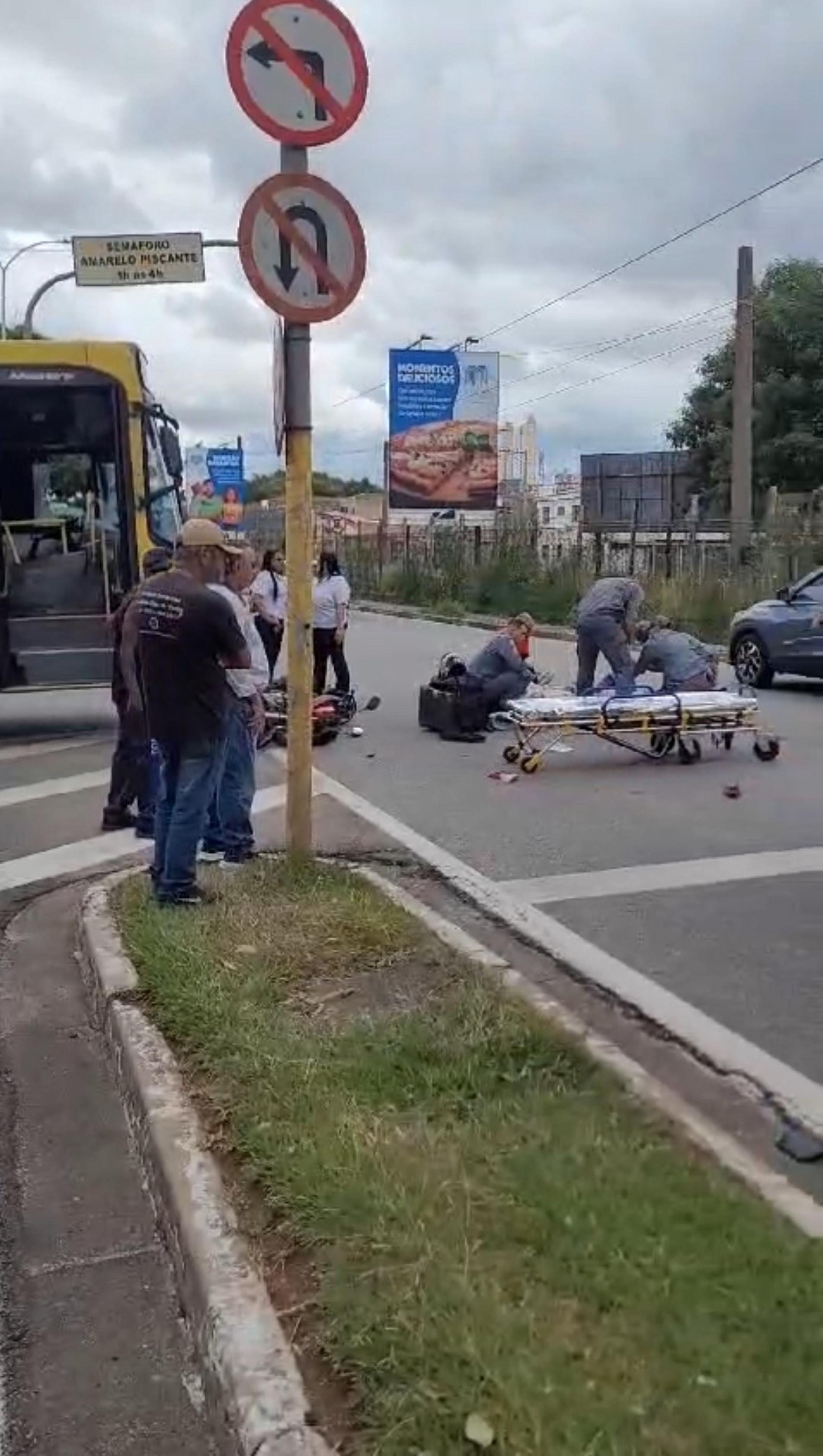 Um motociclista de entrega teria passado o sinal vermelho, segundo funcionária de uma empresa de ônibus, na avenida, e um coletivo da linha Jardim Rodrigo atropelou o rapaz. A vítima alega que o sinal estava amarelo quando passou.