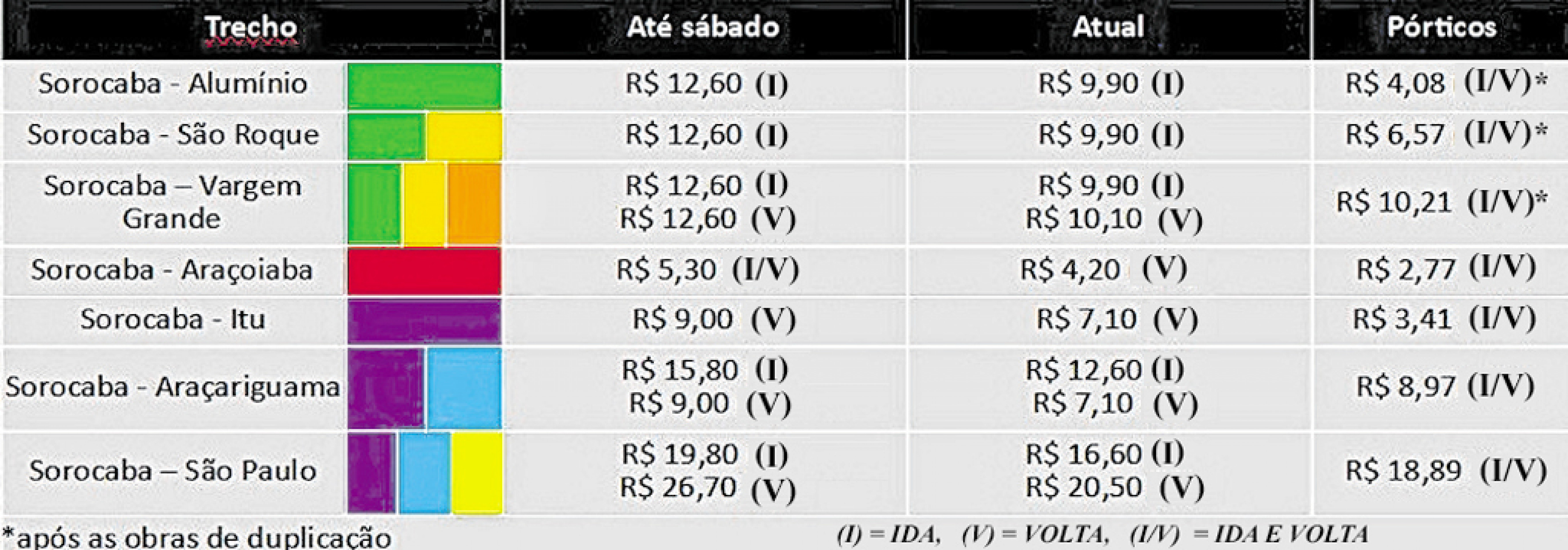Na tabela que ilustra a matéria, pode-se verificar os antigos e novos valores do pedágio, incluindo dos futuros pórticos. Sendo que “I” é ida (sentido capital) e “V” é volta (sentido interior). Onde está “I/V”, paga-se o valor no sentido que está se dirigindo.